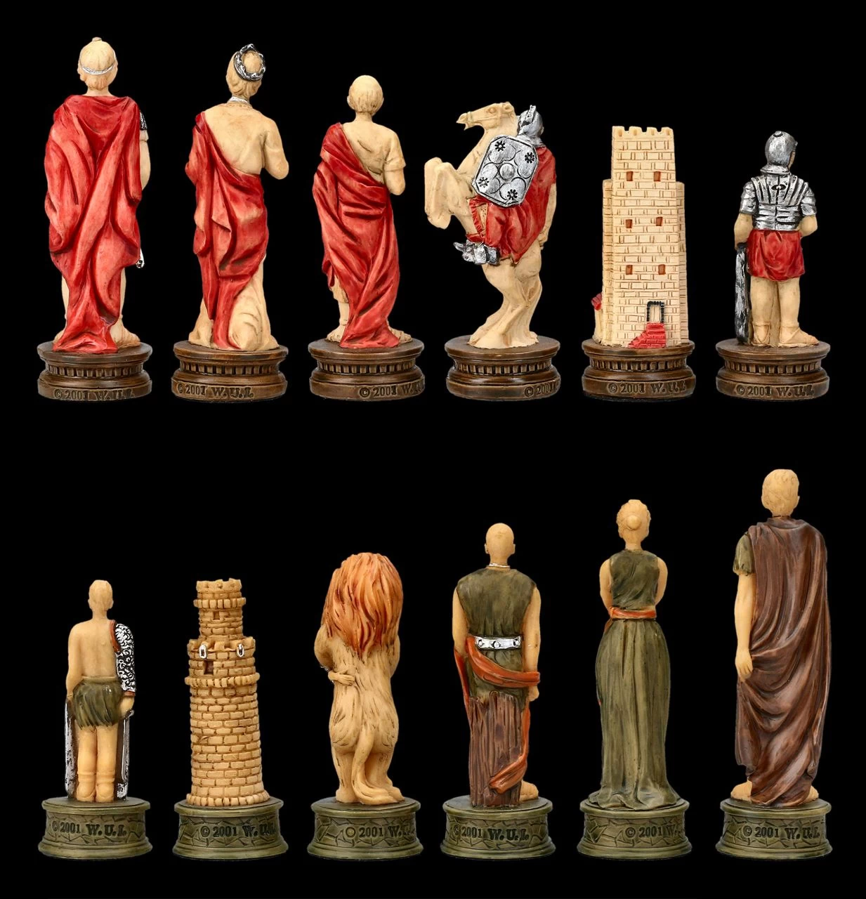 Erst als Rom dem Heerführer Crassus das Kommando übertragen hatte, konnten die unter der Führung von Spartacus tapfer kämpfenden aufständischen Gladiatoren letztendlich in einer vernichtenden Schlacht besiegt werden. So spannend kann auch das Schachspiel mit diesen fantastischen Figuren ausgehen. Detailreich aus Kunststein (Polyresin) gefertigt und sorgfältig handbemalt zeigen diese Schachfiguren auf der einen Seite die Römer mit ihrem Heerführer, der Dame, Angehörigen der Verwaltung und berittenen Soldaten und auf der anderen Seite die Gladiatoren und ihre Anhänger, wobei Löwen die Rolle des Pferdes übernehmen. Das fantastische Schachfiguren Set beinhaltet 32 Figuren, wobei zum Beispiel der König 8 cm hoch ist und die Bauernfigur 6 cm. Die Figuren dieses Sets haben eine Stellfläche von 2,6 cm. Weitere fantastische und als prachtvolles Präsent geeignete Schachfiguren finden Sie in unserem Shop