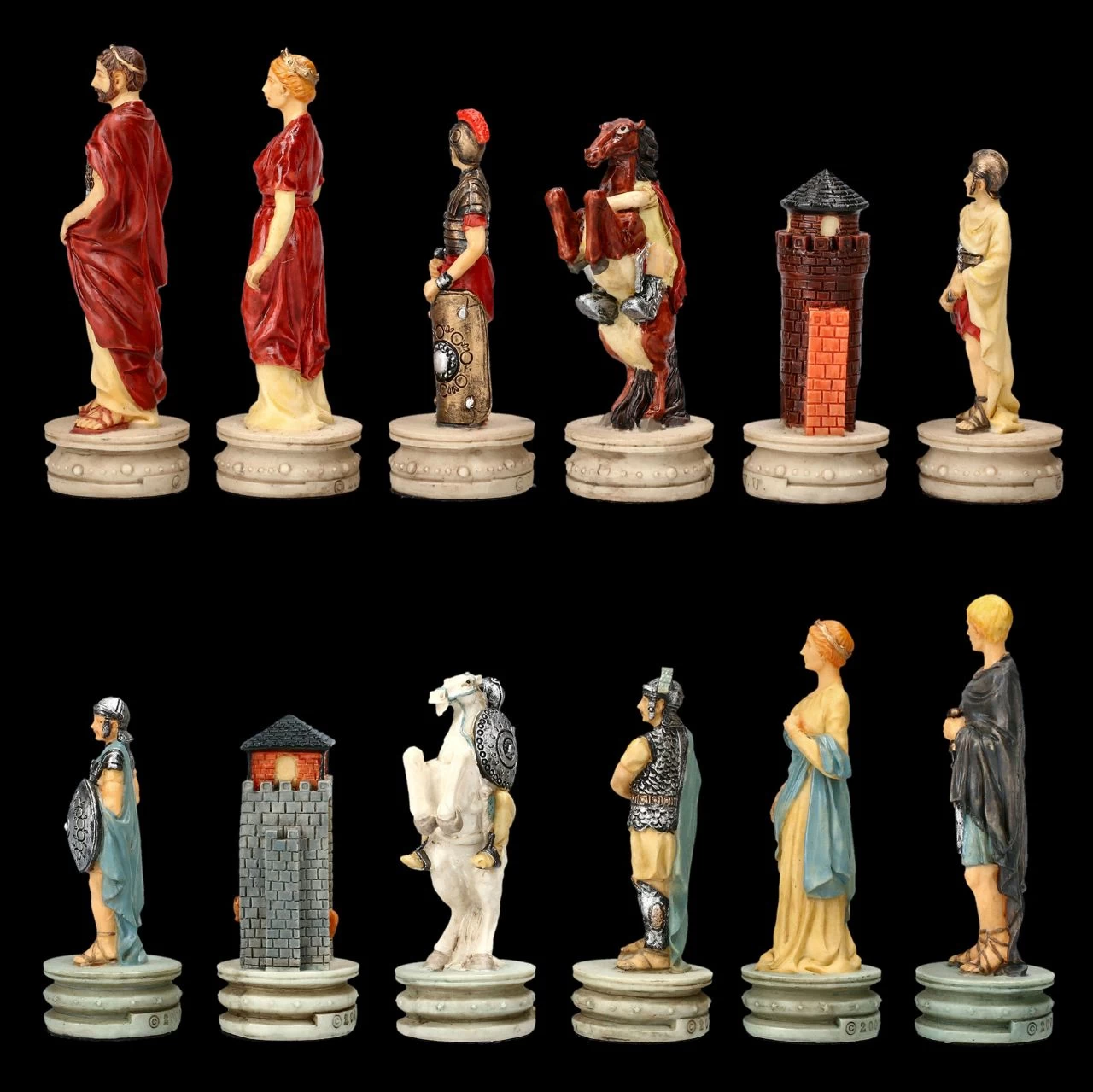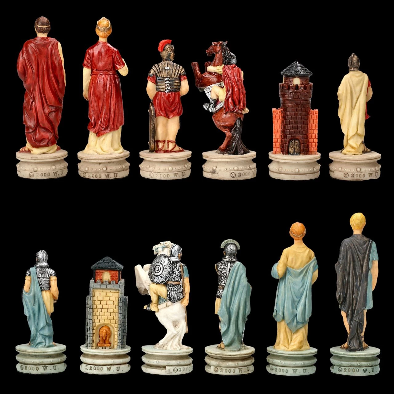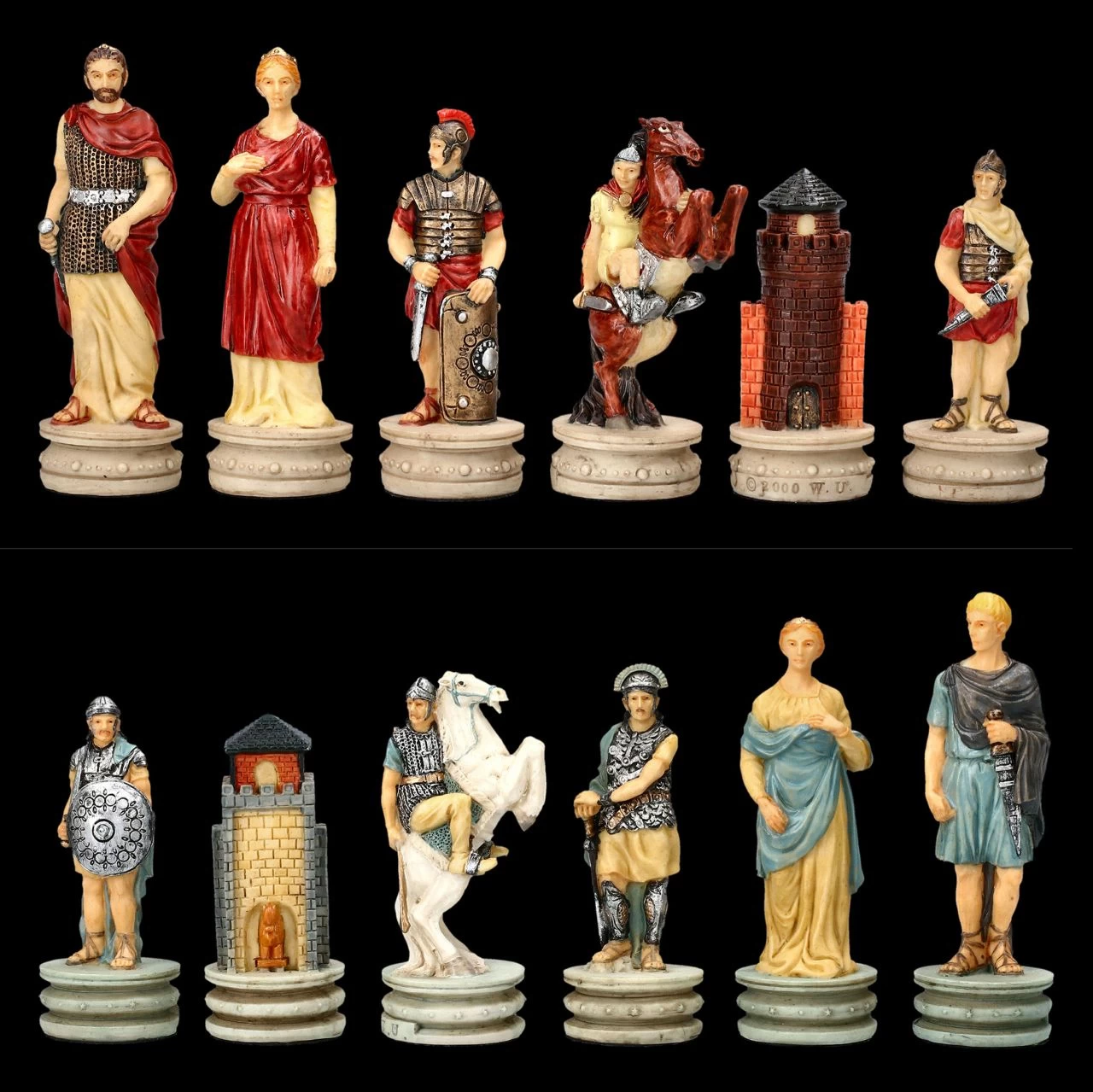 Immer wieder sind die römischen Legionen und die griechische Phalanx in Kämpfen aufeinander getroffen. Durch ihre Wendigkeit, der eisernen Speerspitze und durch ihr Kurzschwert für den Nahkampf waren die Römer immer wieder im Vorteil. So spannend wie der Kampf Römer vs. Griechen kann auch das Schachspiel mit diesen fantastischen Figuren ausgehen. Wunderbar detailreich aus Kunststein (Polyresin) gefertigt und sorgfältig handbemalt zeigen diese fantastischen Schachfiguren auf der einen Seite die Römer mit ihrem Heerführer und den Angehörigen in Rottönen und auf der anderen Seite die Figuren der Griechen in Blautönen. Das faszinierende Schachfiguren Set beinhaltet 32 Figuren, wobei zum Beispiel die Königsfigur jeweils 8 cm hoch ist und die Bauernfigur jeweils 6,5 cm. Die Figuren dieses Sets haben eine Stellfläche von 2,8 cm. Weitere fantastische, als prachtvolles Präsent geeignete Schachfiguren finden Sie in unserem Shop