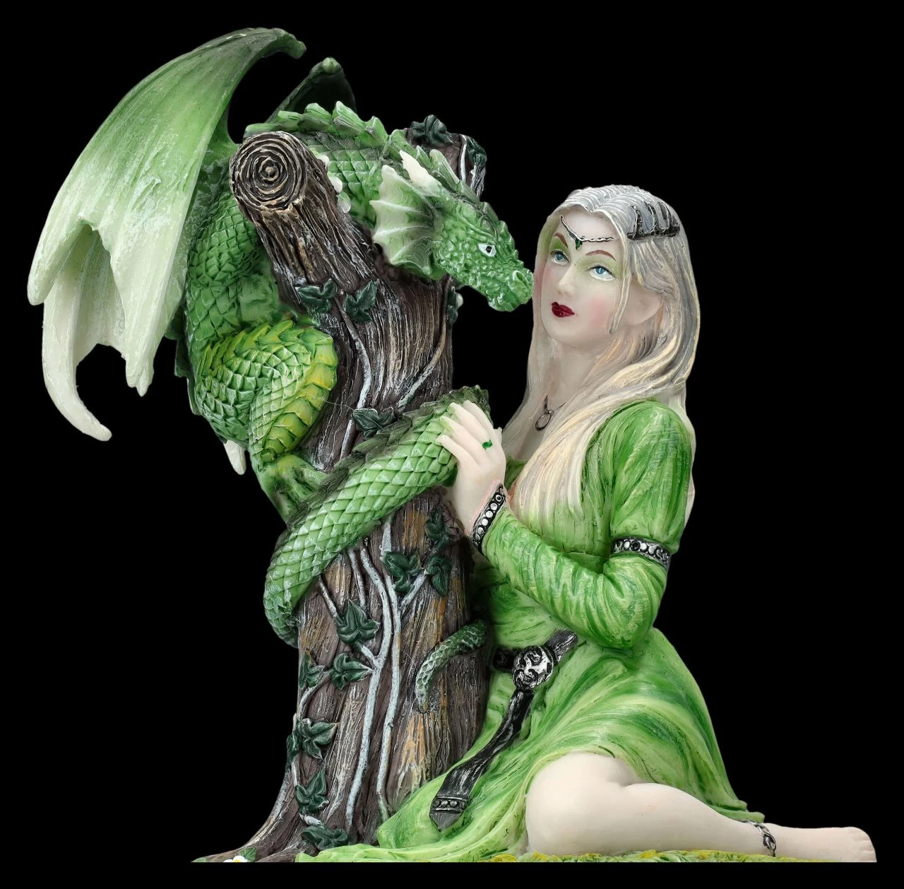 Was gibt es Erfrischenderes, als ein Spaziergang im kühlen grünen Wald an heißen Sommertagen… Auf der kleinen grünen Lichtung kniet die schöne Elfe in ihrem langen grünen Kleid vor einem Baumstumpf, auf dem ihr grüner Drache Platz genommen hat. Die beiden scheinen sich angeregt zu unterhalten. Die kunstvolle und durch die Grüntöne sehr keltisch anmutende Schatulle mit dem Motiv ‚Dragon Friendship – Sommer‘ der beliebten Fantasykünstlerin Anne Stokes ist einfach bezaubernd. Die aufwändig aus liebevoll handbemaltem Kunststein (Polyresin) gefertigte Schatulle ist 20 cm hoch, 12 cm breit und 12,5 cm tief. Innen hat die zauberhafte Schatulle mit den Maßen H: 5,5 cm / B: 9 cm / T: 10 cm Platz für kleine Kostbarkeiten. Die Schatulle mit dem Drachenmotiv kommt inklusive eines toll bedruckten Geschenkkartons und ist für alle Freunde magischer Wesen und alle Anne Stokes-Fans ein wunderbares Geschenk. In unserem Shop gibt es übrigens weitere märchenhafte Motive aus dieser Serie.