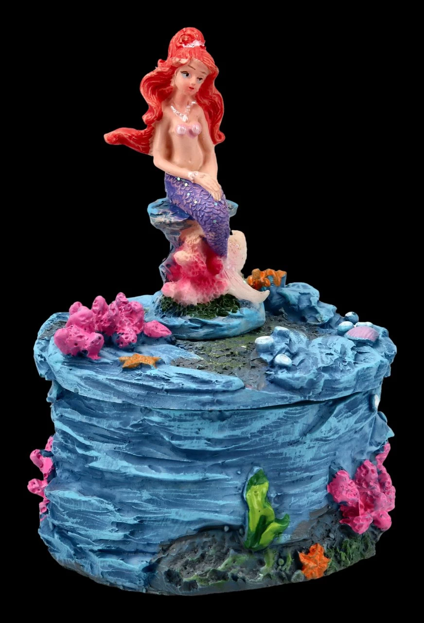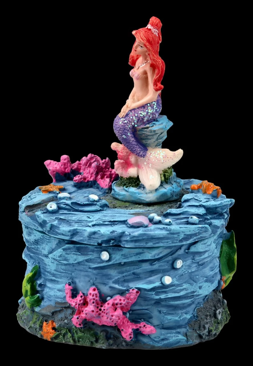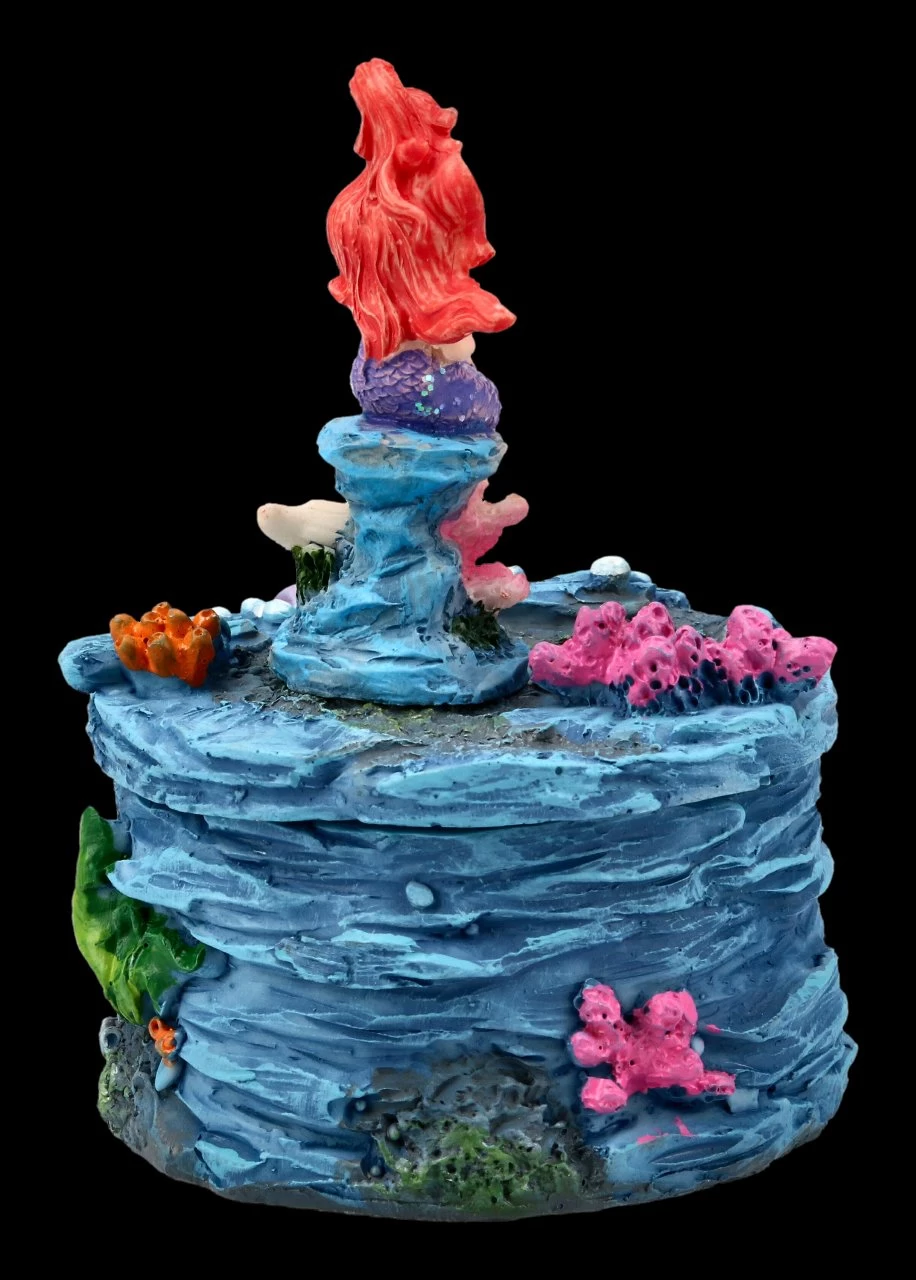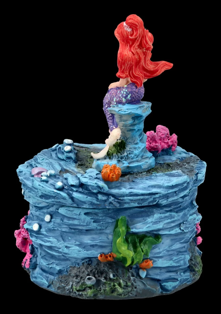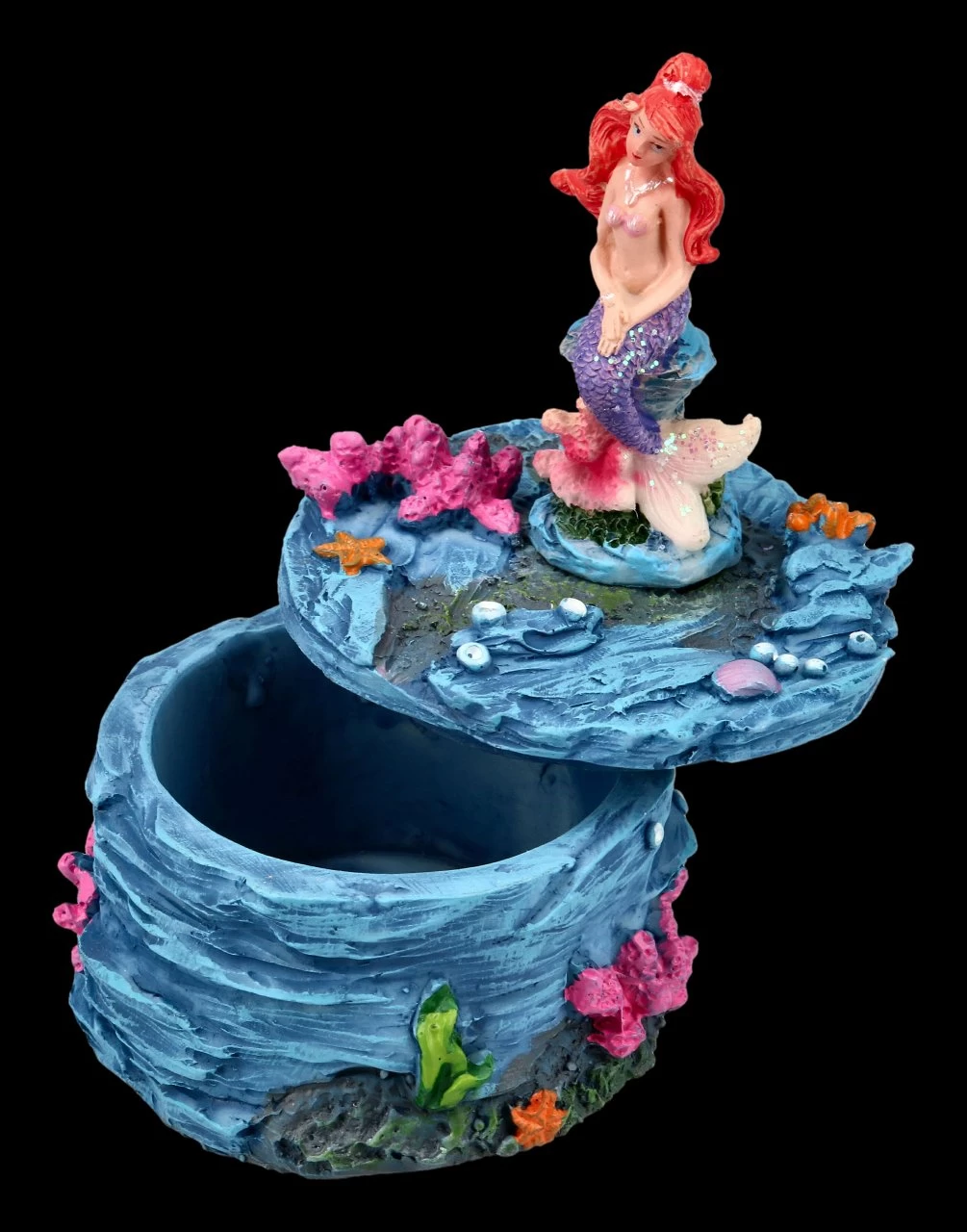 Auf dem hübschen kleinen Schmuckdöschen sitzt eine niedliche Meerjungfrau mit roten Haaren auf einer Koralle am Meeresgrund und schaut verträumt vor sich hin. Mit vielen Details aus Kunststein (Polyresin) gefertigt und liebevoll handbemalt, hat die kleine Schatulle eine Gesamthöhe von 8,5 cm, eine Breite von 6 cm und eine Tiefe von 6 cm, wobei die Figur 5 cm hoch ist. Innen hat die süße Schatulle mit einer Höhe von 2,5 cm und einem Durchmesser von 4,5 cm Platz für ein kleines Geschenk.