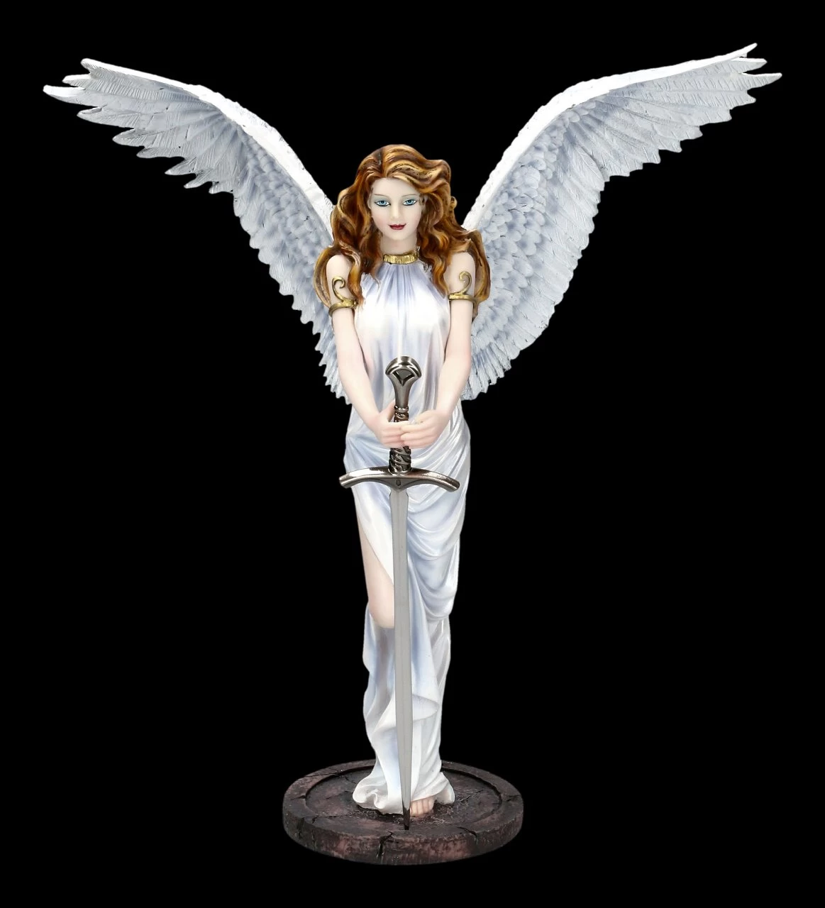 Der Schutzengel Azrael ist der Engel Gottes, der den Übergang liebevoll und fürsorglich begleitet. Diese traumhafte Engelfigur in dem langen weißen, beinahe durchsichtigen, Kleid und mit den wunderschönen fliligranen Flügeln hat einen Brieföffner aus Metall in Schwertform in den Händen. Der prachtvolle Engel ist detailreich aus Kunststein (Polyresin) gefertigt und liebevoll handbemalt. Die herrlichen Flügel sind zum Stecken. Die wunderschöne und bezaubernde Engelfigur ist 33 cm hoch, 32 cm breit und hat eine Tiefe von 17,5 cm. Die Schwertlänge des herausehmbaren Brieföffners beträgt 22 cm. Der Engel Azrael veredelt als wunderbare Deko und als eleganter Brieföffner jeden Arbeitsplatz und ist auch ein fantastisches Geschenk.