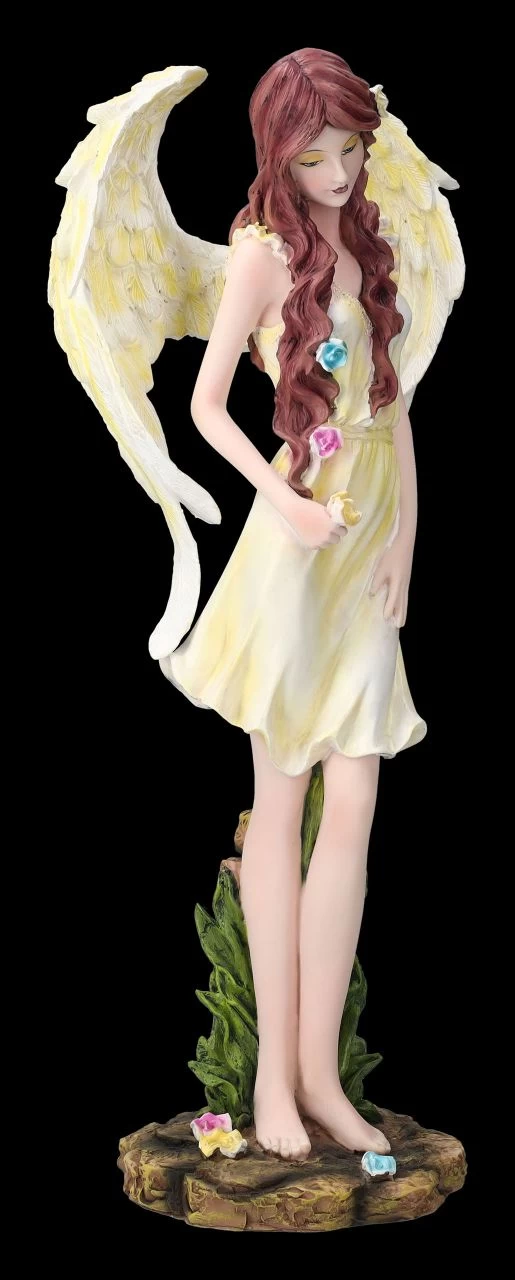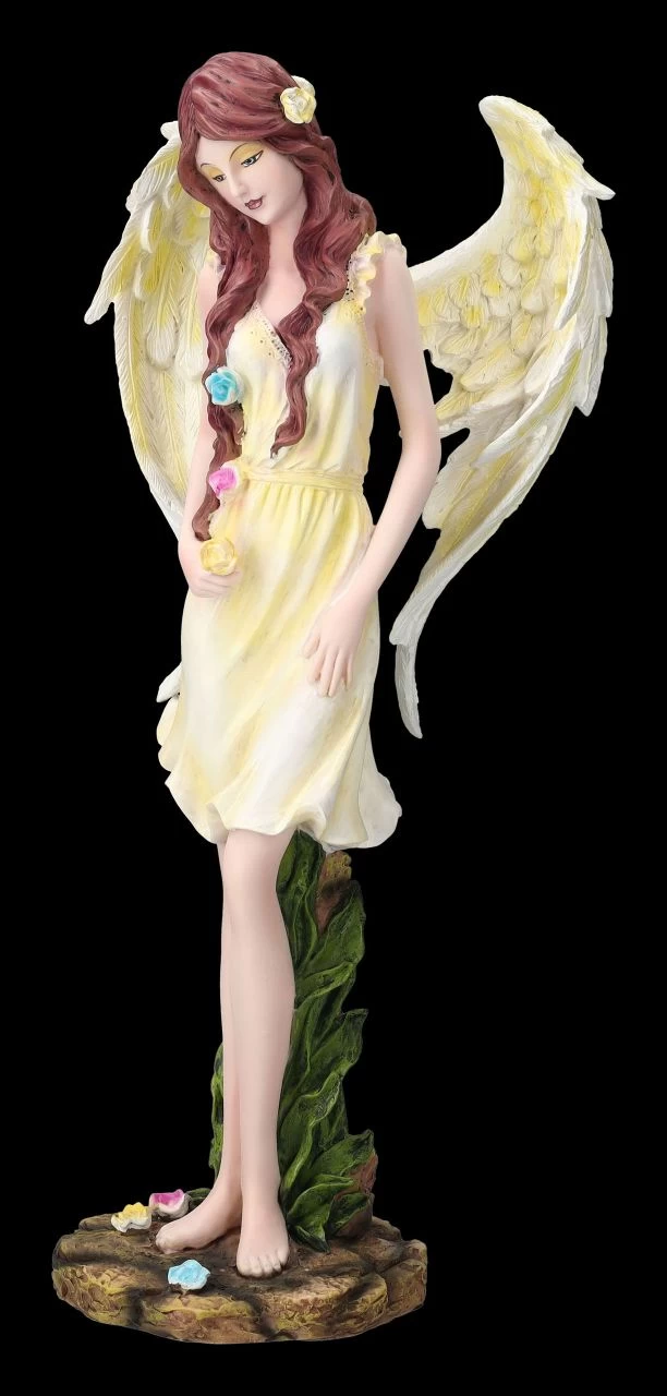 Frühlingshaft und wunderhübsch ist dieser 34 cm hohe, 17 cm breite und 13 cm tiefe Engel Cioliel im zart gelben Kleidchen und mit den zart gelben Flügeln. Schon bei Talmud heißt es ‚Jeder Grashalm hat seinen Engel, der sich über ihn beugt und ihm zuflüstert: Wachse, wachse!‘ Der niedliche Engel scheint auf jeden Fall Rosen zu lieben und zu beschützen, denn Rosenblüten schmücken die langen braunen Haare und eine schöne Blüte hält er in seinen Händen. Vielleicht ist es gerade dieser liebevoll handbemalte und detailreich aus Kunststein (Polyresin) gefertigte Engel, der darauf wartet, einen schönen Platz bei den Blumen in deiner Wohnung zu bekommen. Cioliel ist aber auch ein liebevolles Geschenk für jemanden, dem Sie zeigen möchten, dass immer ein Schutzengel in der Nähe ist. Die hübschen Flügel sind zum Stecken.