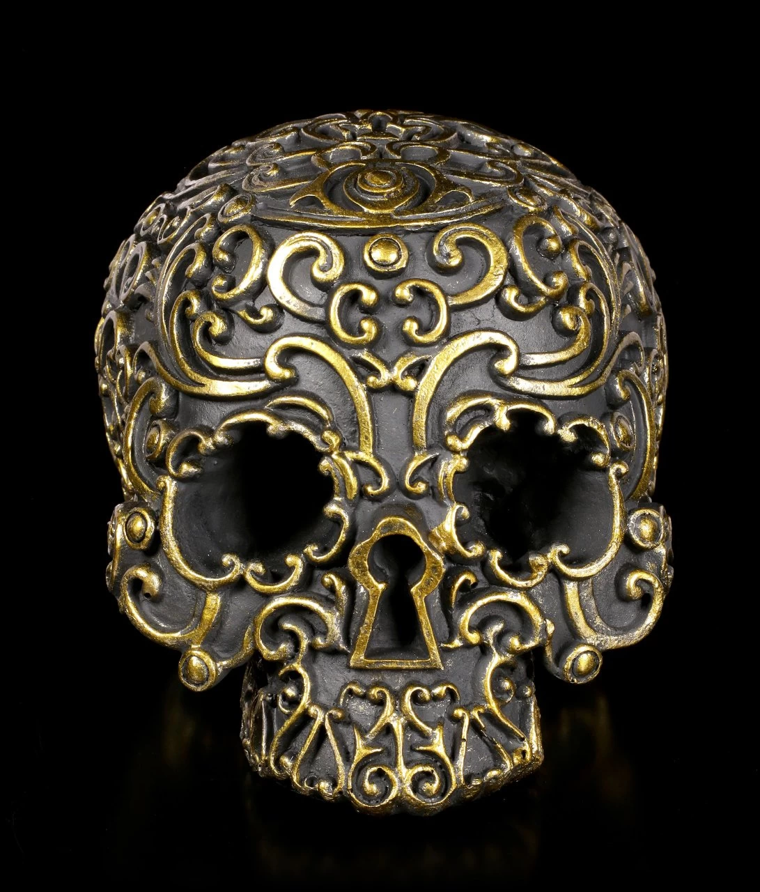 Der edel Totenkopf erinnert an ein reich verziertes Türschloss. Die goldfarbenen Ornamente heben sich wundervoll von dem schwarzen Grund ab. Wenn Sie auf der Suche nach einer tollen Ergänzung Ihrer Schädel Sammlung sind, ist dieser handbemalte Schädel aus Kunststein (Polyresin) perfekt für Sie.
