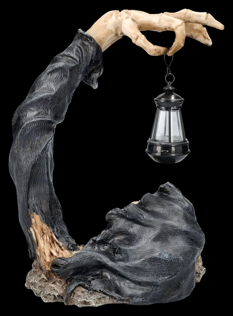Die einen werden sich vielleicht selbst an Halloween fürchten und nicht klingeln, wenn sie den aus dem Grab steigenden Reaper vor der Haustür entdecken. Andere werden sich aber auch perfekt empfangen fühlen, denn schließlich leuchtet ihnen der Reaper mit seiner Laterne den Weg… Die Laterne des fröhlich grinsenden Reapers benötigt zum Leuchten 3 x LR41 Batterien, die jedoch nicht in der Lieferung enthalten sind. Die witzige Sensenmann-Figur ist aus handbemaltem Kunststein (Polyresin) und 29,5 cm hoch, 21,5 cm breit und 14 cm tief. An Halloween oder auch bei einer Gruselparty bietet der Reaper doch den perfekten Empfang.