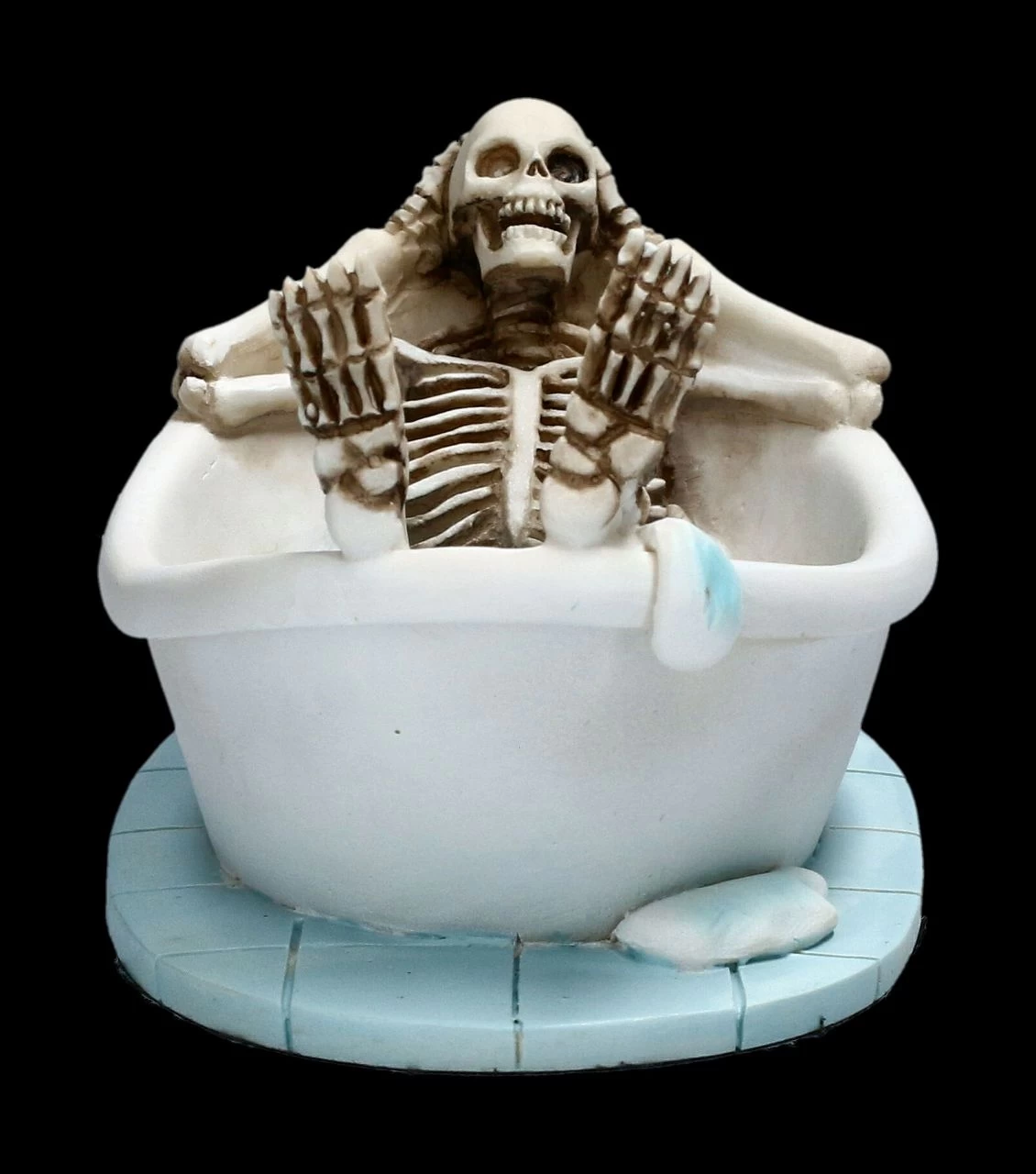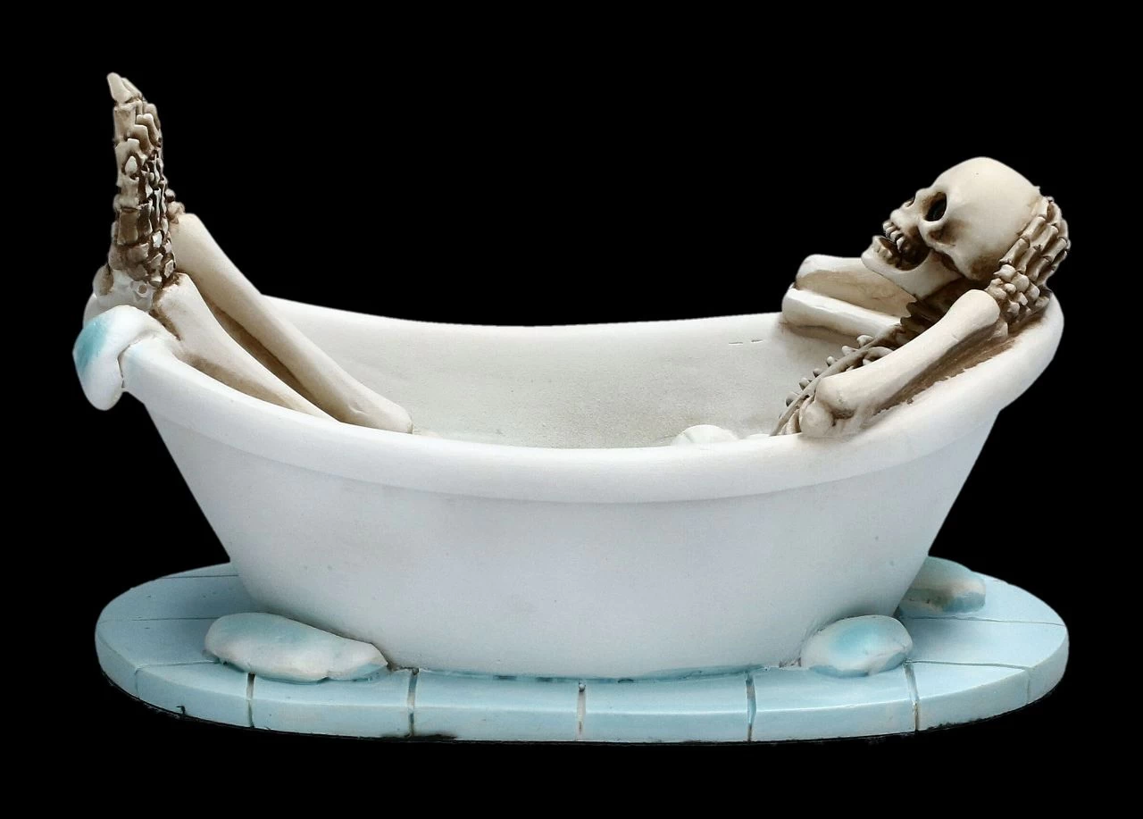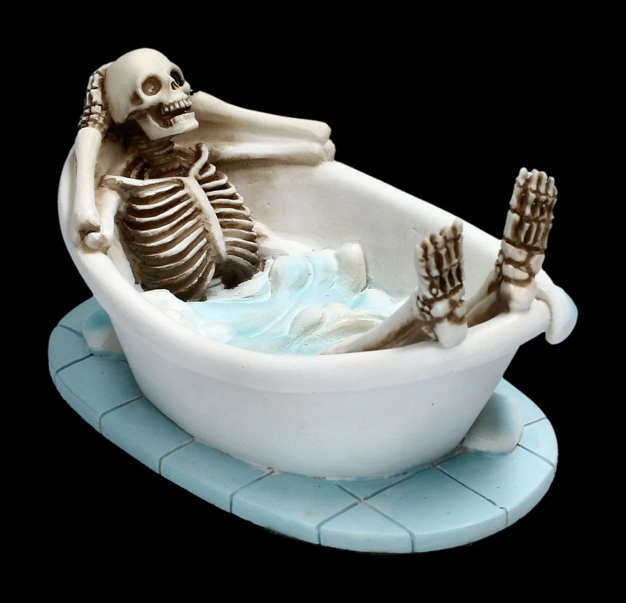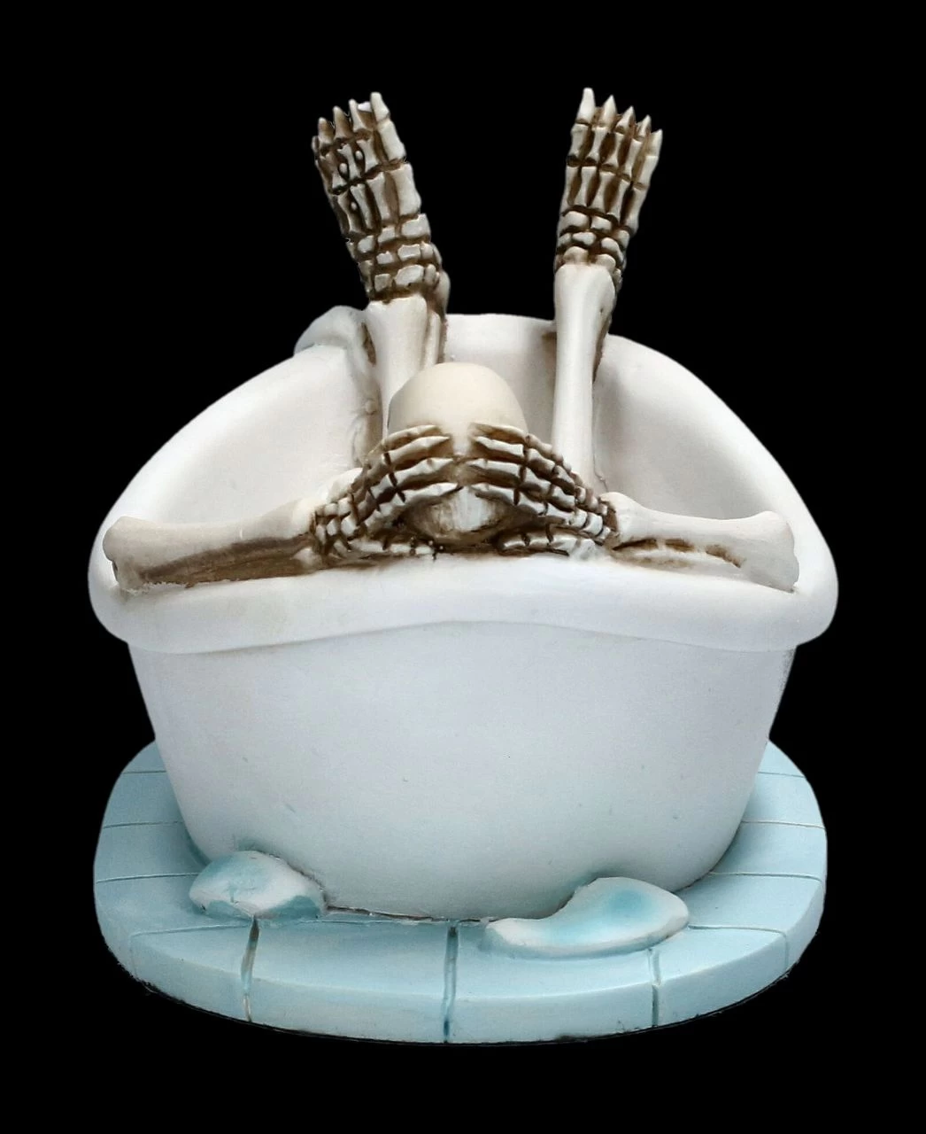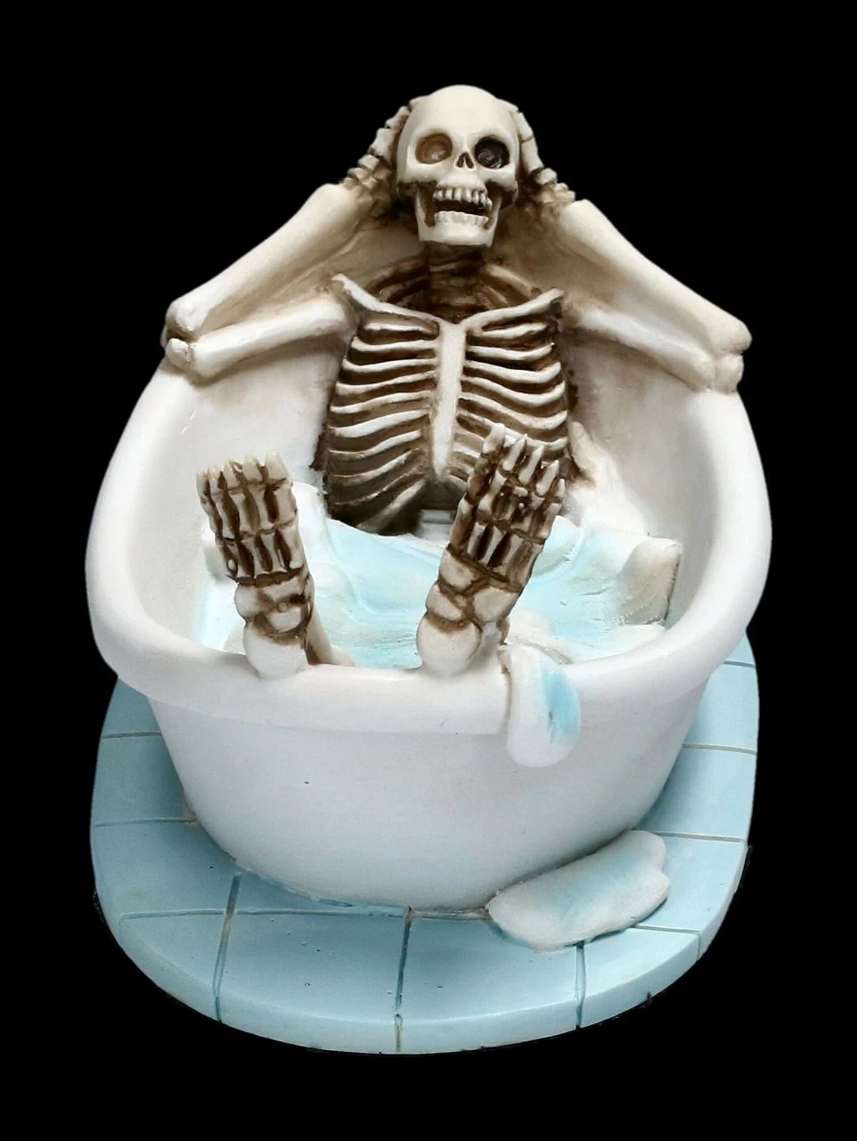 Na wer sagt denn, dass man nicht auch als Skelett mal ein warmes, duftendes Schaumbad genießen kann ? Ein bisschen Planschen ist wohl auch erlaubt, auch wenn etwas Schaum über die ohnehin etwas zu kleine, ovale weiße Badewanne auf den hellblauen Fliesenboden getropft ist… Dieses lustige Skelett ist mit der Badewanne 7,5 cm hoch, 12,0 cm breit und 8,0 cm tief. Es ist aus Kunststein (Polyresin) gefertigt und wurde handbemalt. Ein lustiges Geschenk für Freunde mit Humor!