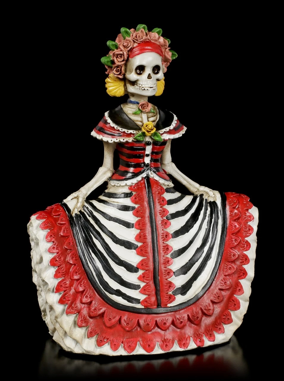 Anmutig und grazil tanzt die Senorita auf ihren Todestagsball. Diese wunderschöne Day of the Dead Skelett Figur wurde aus hochwertigem Kunststein (Polyresin) angefertigt und liebevoll handbemalt. Diese Figur wird Sie verzaubern.