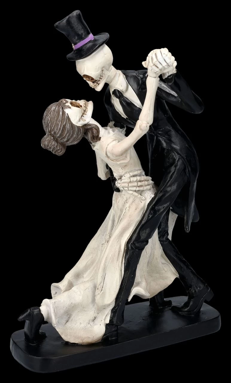 Für immer und ewig bleibt so die Erinnerung an den Hochzeitstanz erhalten. Sie im weißen Brautkleid und er im Smoking mit Zylinder – das schwungvoll tanzende Skelett-Brautpaar lädt zum Mittanzen ein. Aus handbemaltem Kunststein (Polyresin) gefertigt, ist diese 31 cm hohe, 20 cm breite und 12 cm tiefe Skelettfigur ein vielsagendes Geschenk für ein Brautpaar – vor allem, wenn sie leidenschaftlich gerne tanzen. Das tanzende Skelett-Brautpaar ist aber auch als ungewöhnliche und humorvolle Deko auf der Hochzeitstafel geeignet.