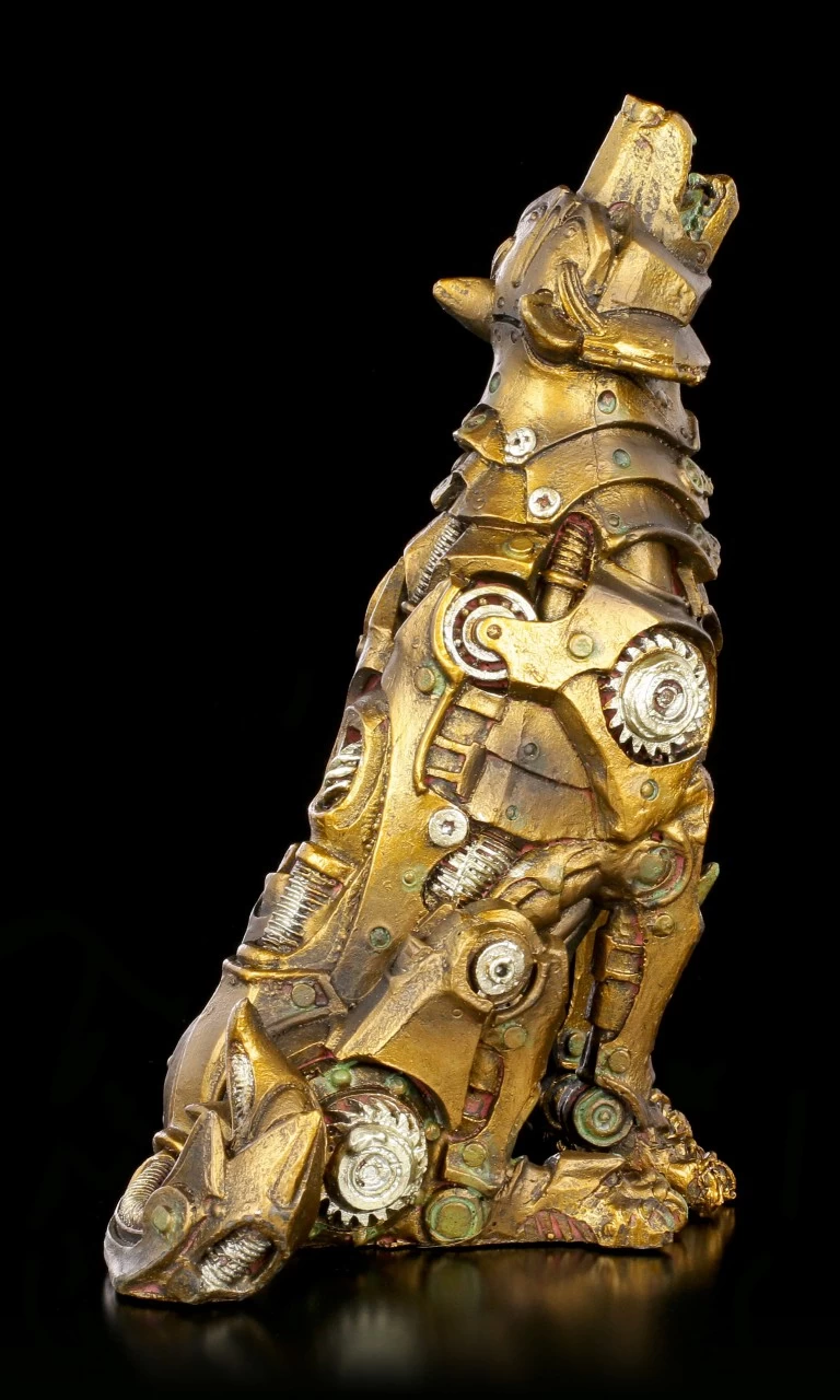 Diese heulende Wolf lässt alle Steampunk Herzen höher schlagen. Durch die vielen kleinen Schrauben und das metallische Aussehen, wirkt der Wolf wie eine maschinelle Kreatur. Er ist ein Höhepunkt einer Steampunk Kollektion.