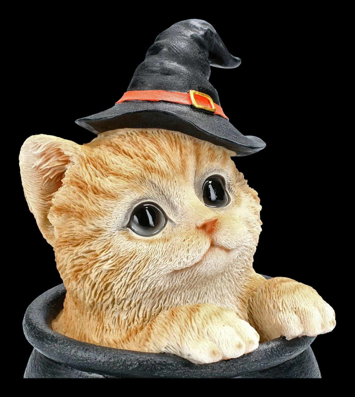 Sucht mich denn keiner, scheint sich dieses süße rote Tigerkatzenbaby zu fragen. Da war das Versteck im Hexenkessel wohl doch zu gut, oder macht mich vielleicht mein Hexenhut unsichtbar? Diese kleine süße Tabby Hexen-Katze ist mit dem Kessel 16,0 cm hoch, 11,0 cm breit und 10,0 cm tief und aus handbemaltem Kunststein (Polyresin). Das zauberhafte Kätzchen ist nicht nur zu Halloween ein tolles Geschenk für Katzenfreunde.