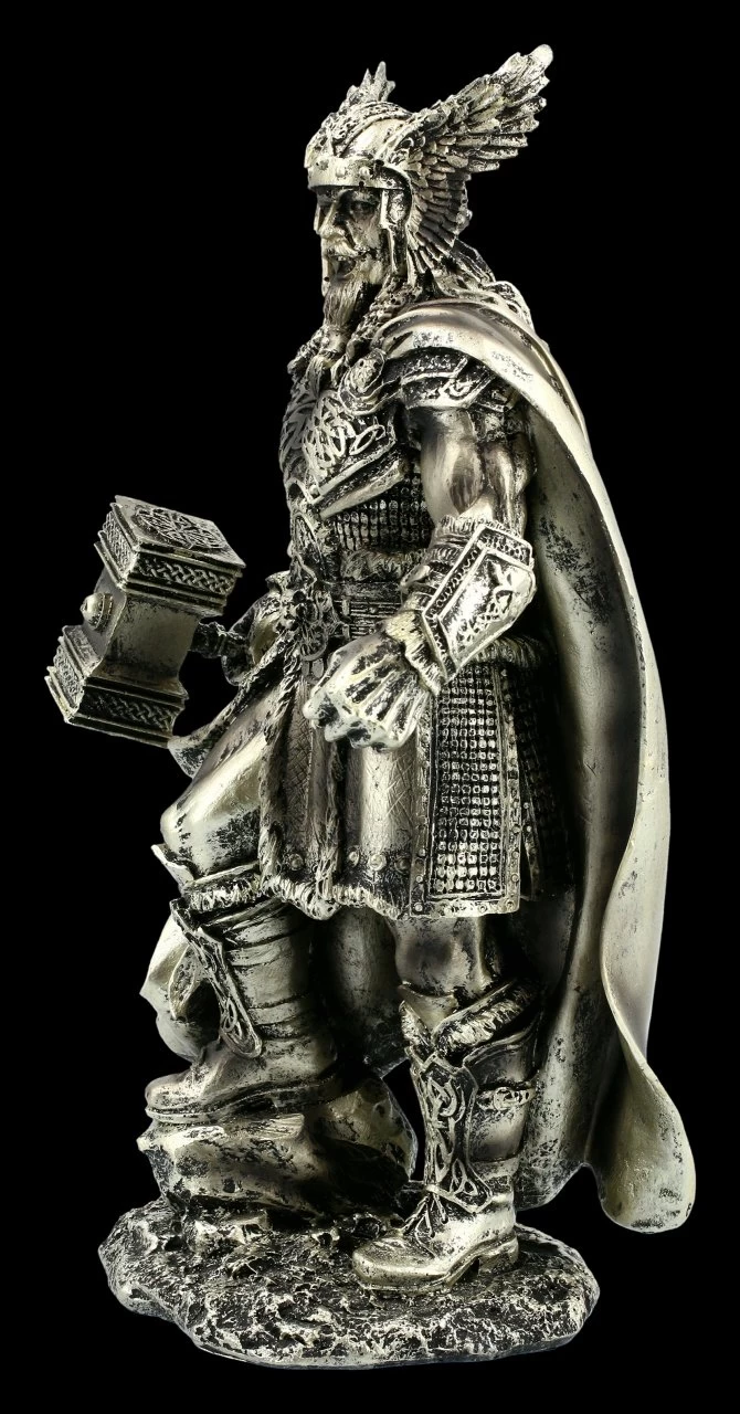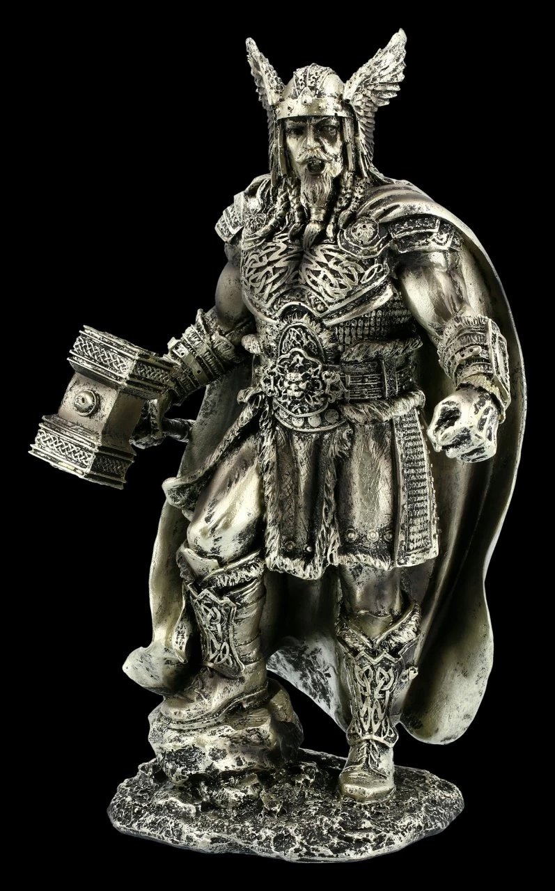 Was für eine beeindruckende Erscheinung! Thor, der Donnergott ist herabgestiegen. In seiner Faust hält er seinen Hammer, Mjölnir. Was mag ihn zu solch einem Schritt bewogen haben? Die tolle bronzefarbene Götter Figur aus Kunststein (Polyresin) ist für alle Wikinger Fans ein Must Have.
