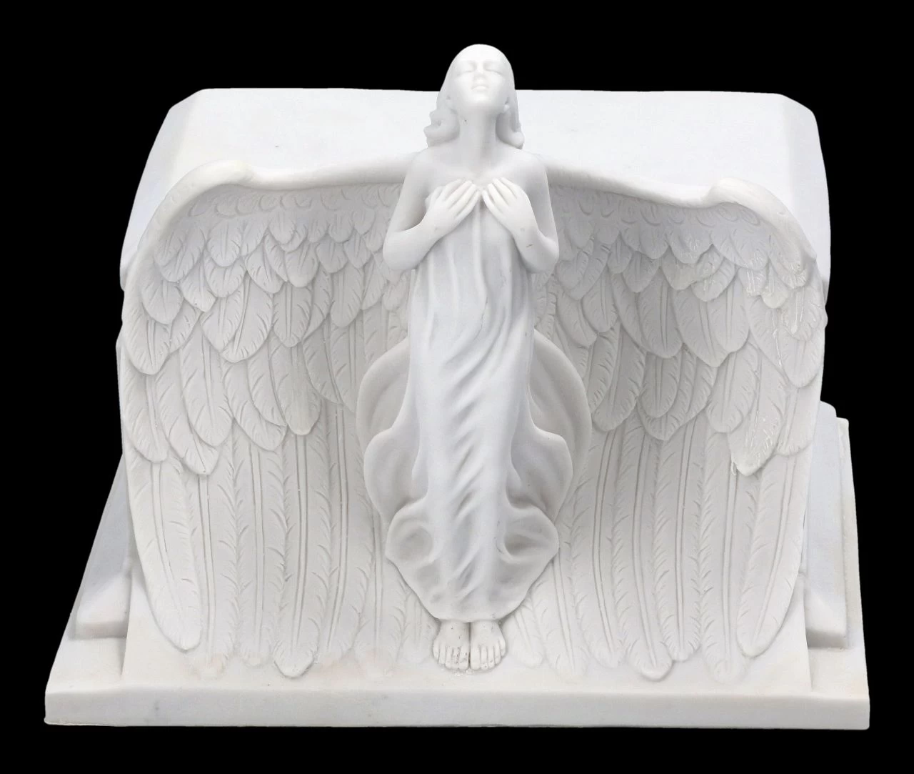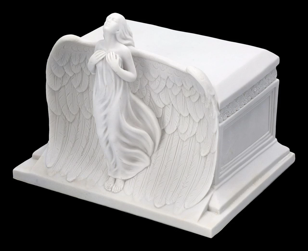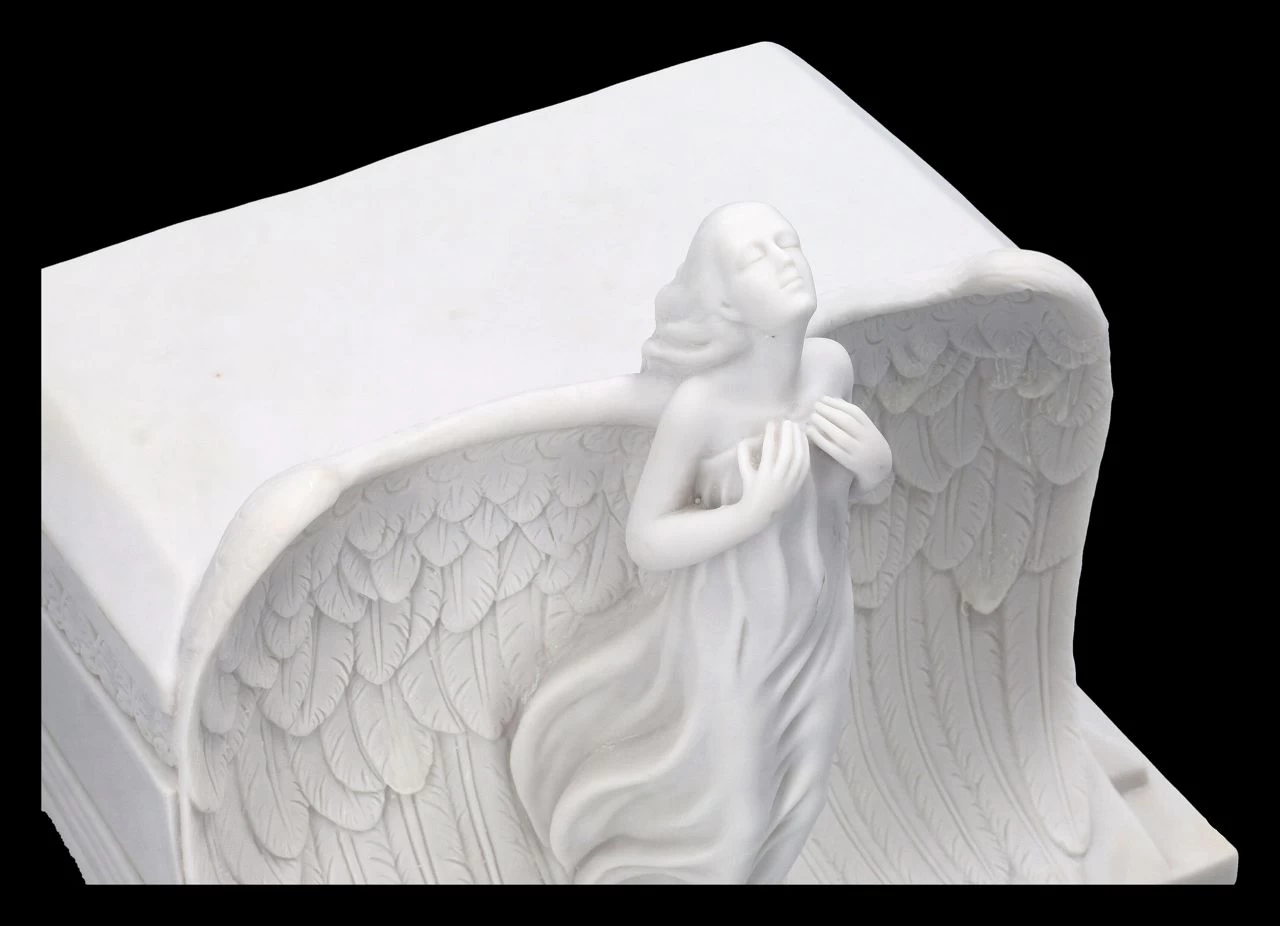 Mit weit ausgebreiteten Flügeln steigt der wunderschöne Engel empor, um die Seele Ihres treuen tierischen Freundes auf der Straße in die Ewigkeit zu begleiten. Die wunderschöne Urne in Form eines Grabmals für Ihren treuen Begleiter spendet Ihnen mit dem zauberhaften Engel sicher Trost, denn Sie spüren, dass auch Sie in Ihrer Trauer nicht allein gelassen werden. Der hinreißende Engel als himmlisches Wesen wird Ihnen zeigen, dass sich Ihr Liebling in guten Händen befindet! Die detailreich und sorgfältig aus handbemaltem Kunststein (Polyresin) gefertigte Tier Urne wirkt durch ihre schlichte weiße Farbe sehr edel. Mit der Höhe von 24 cm (Höhe Urne: 15 cm), der Breite von 27 cm und der Tiefe von 20,5 cm kann die beeindruckende Urne mit dem Engel wunderbar stilvoll die Asche Ihres Lieblingstieres aufzunehmen. Die Urne hat ein Volumen von ca. 3 Liter und Sie können mit ihr immer Ihren Schutzengel und die Erinnerung an Ihr Lieblingstier vor sich sehen.
