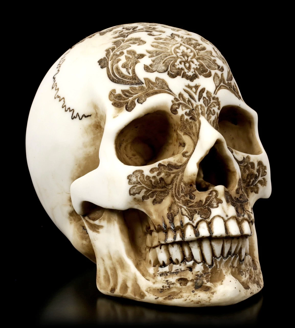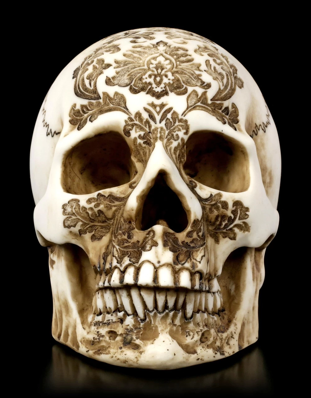 Der Totenkopf Damast wurde reliefartig mit wunderschönen Ornamenten verziert. Der Schädel aus handbemaltem Kunststein (Polyresin) ist wirklich etwas ganz Besonderes, denn er strahlt eine Stärke aus, die Sie begeistern wird.