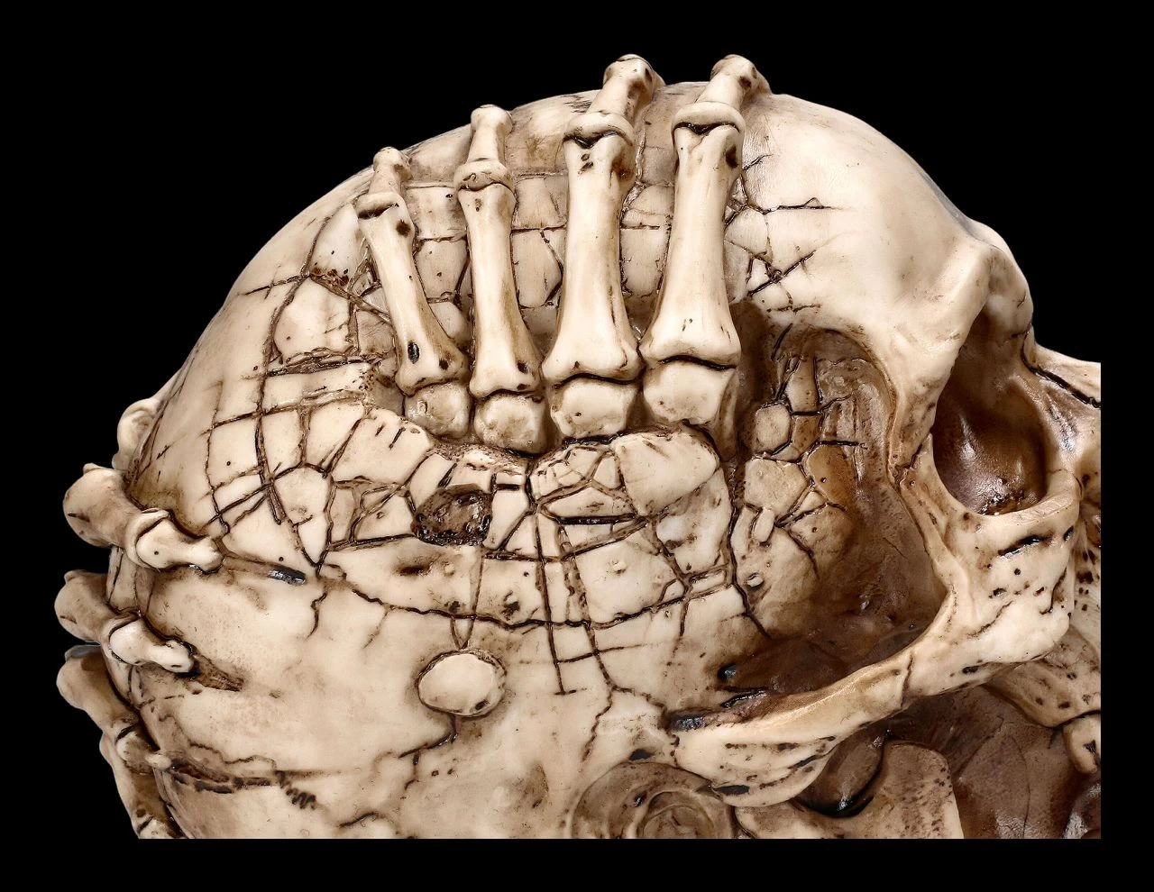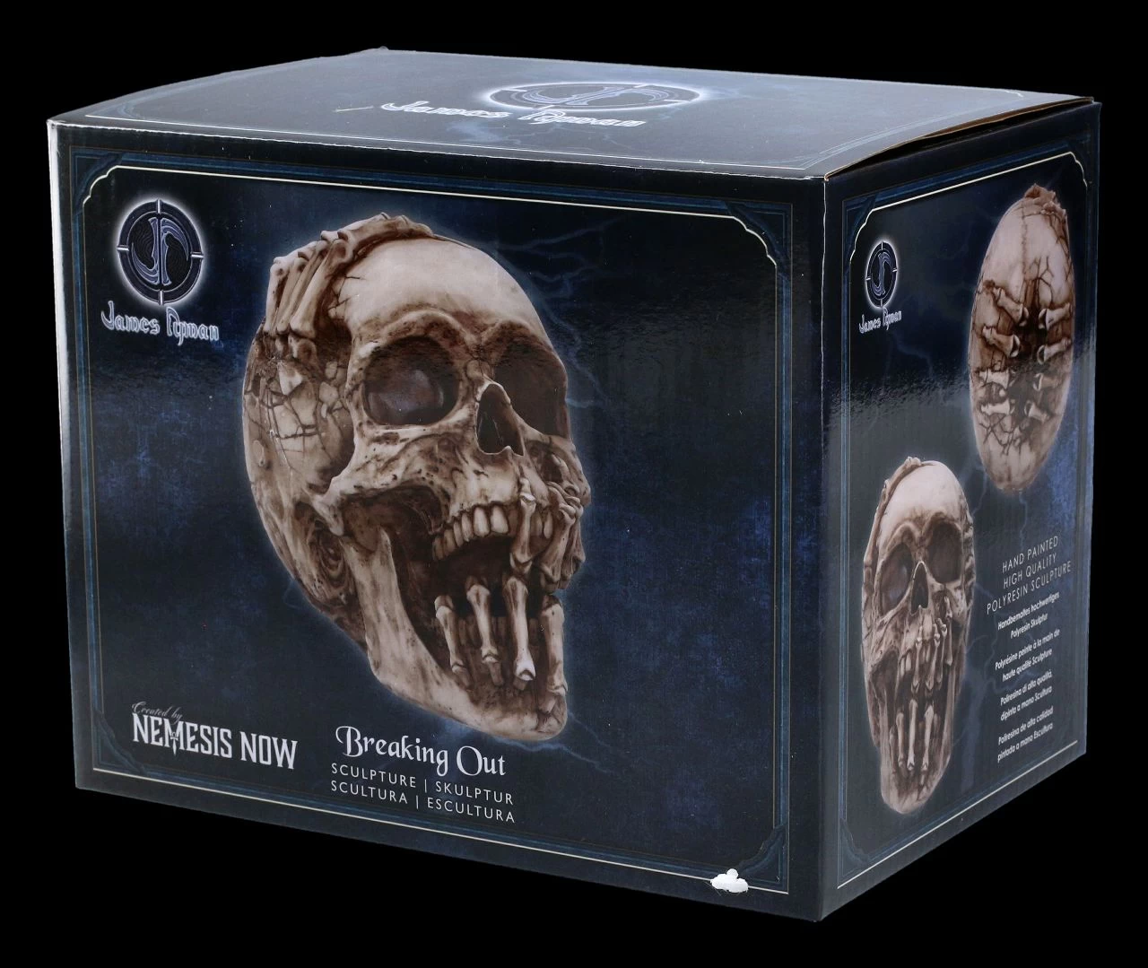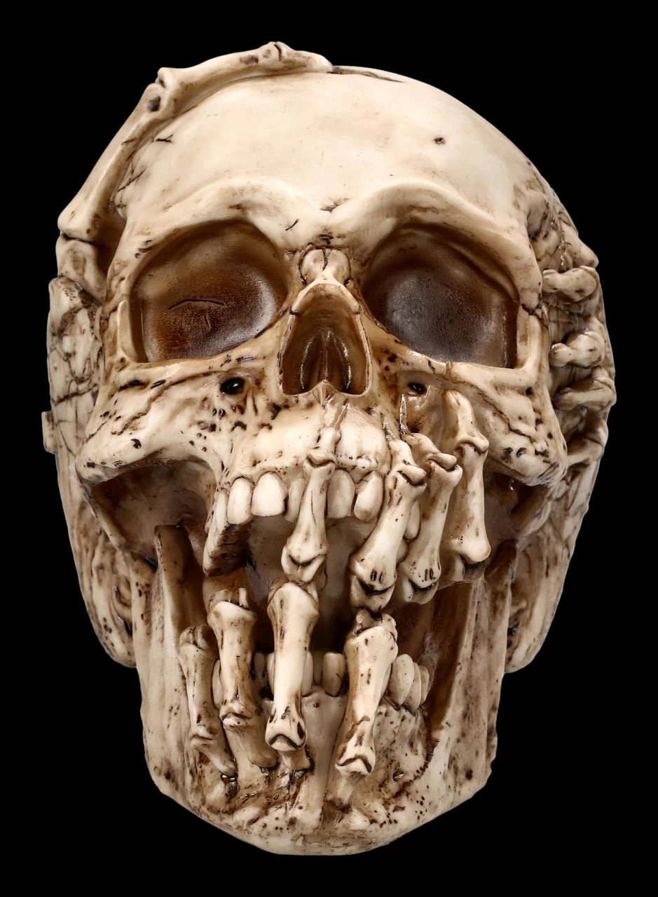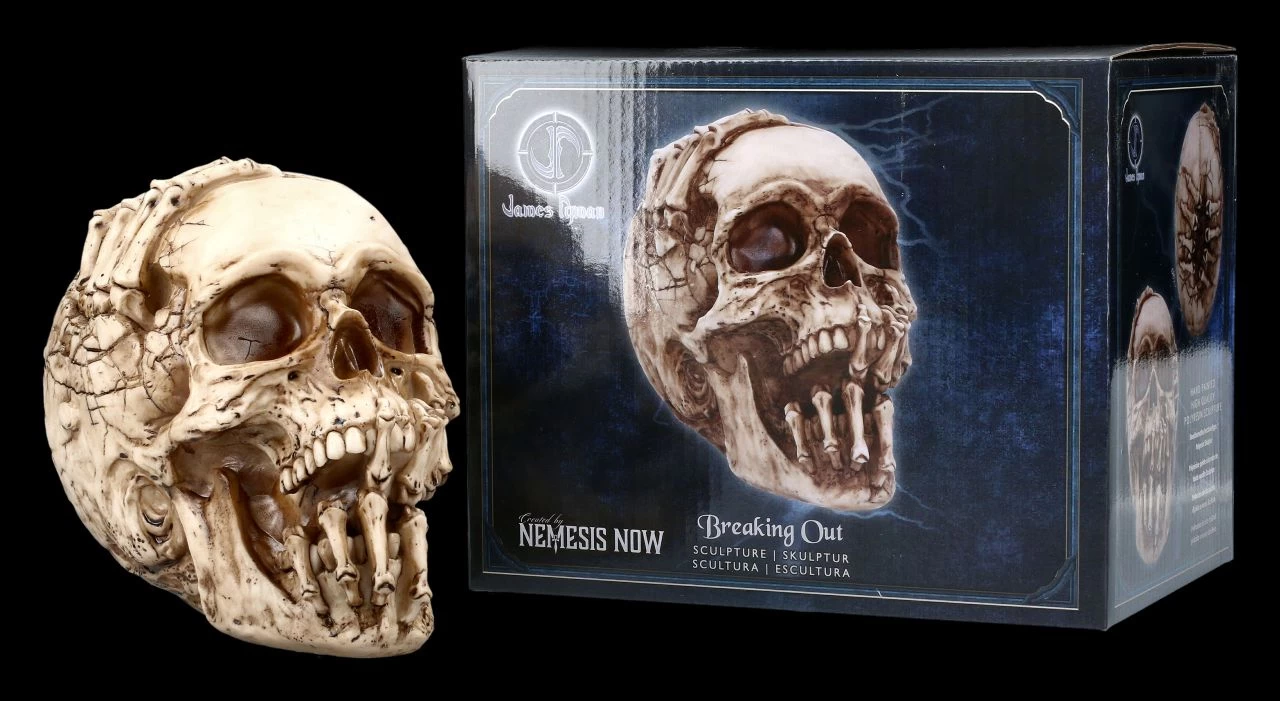 Wehe dem, der sich fürchtet. Wenn sich skelettierte Finger aus diversen Löchern des Schädels bohren, stellt sich die Frage, ob hier das Böse versucht auszubrechen. Der Totekopf wurde von dem berühmten Fantasy- und Horrorkünstler James Ryman gestaltet. Er ist aus detailliert handbemaltem Kunststein (Polyresin) und hat eine Höhe von 14 cm, eine Breite von 12 cm und eine Tiefe von 18 cm. Selbst für alle Horrorfans ist der Totenkopf ‚Breaking Out‘ von James Ryman ein außergewöhnliches Geschenk und wird inklusive einer Geschenkverpackung verschickt.