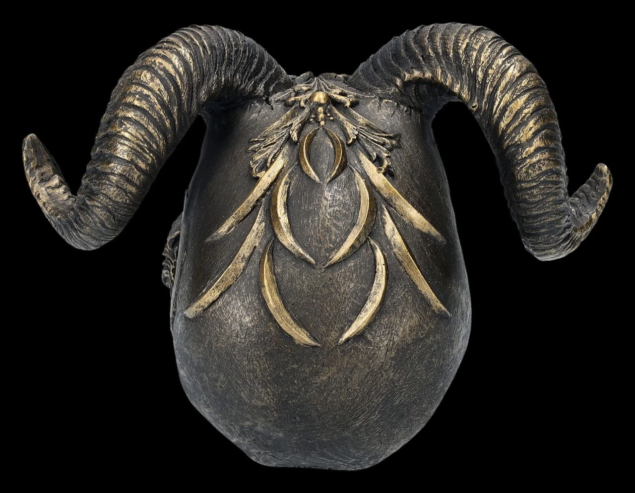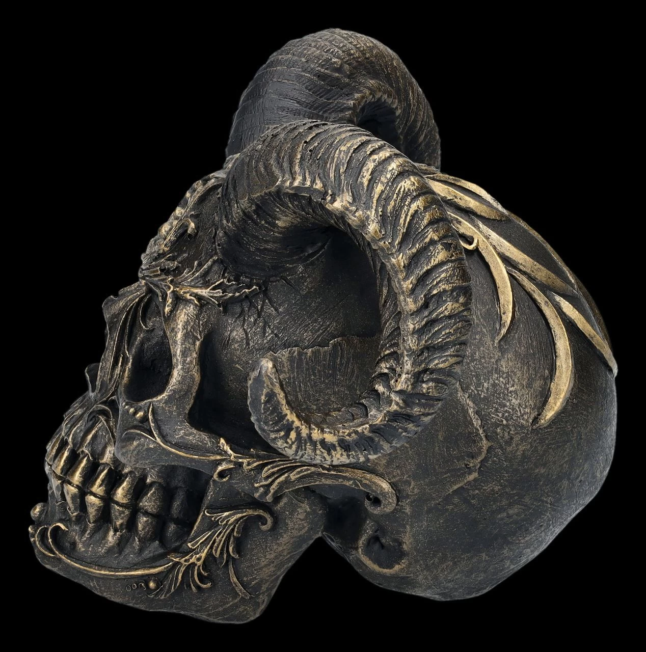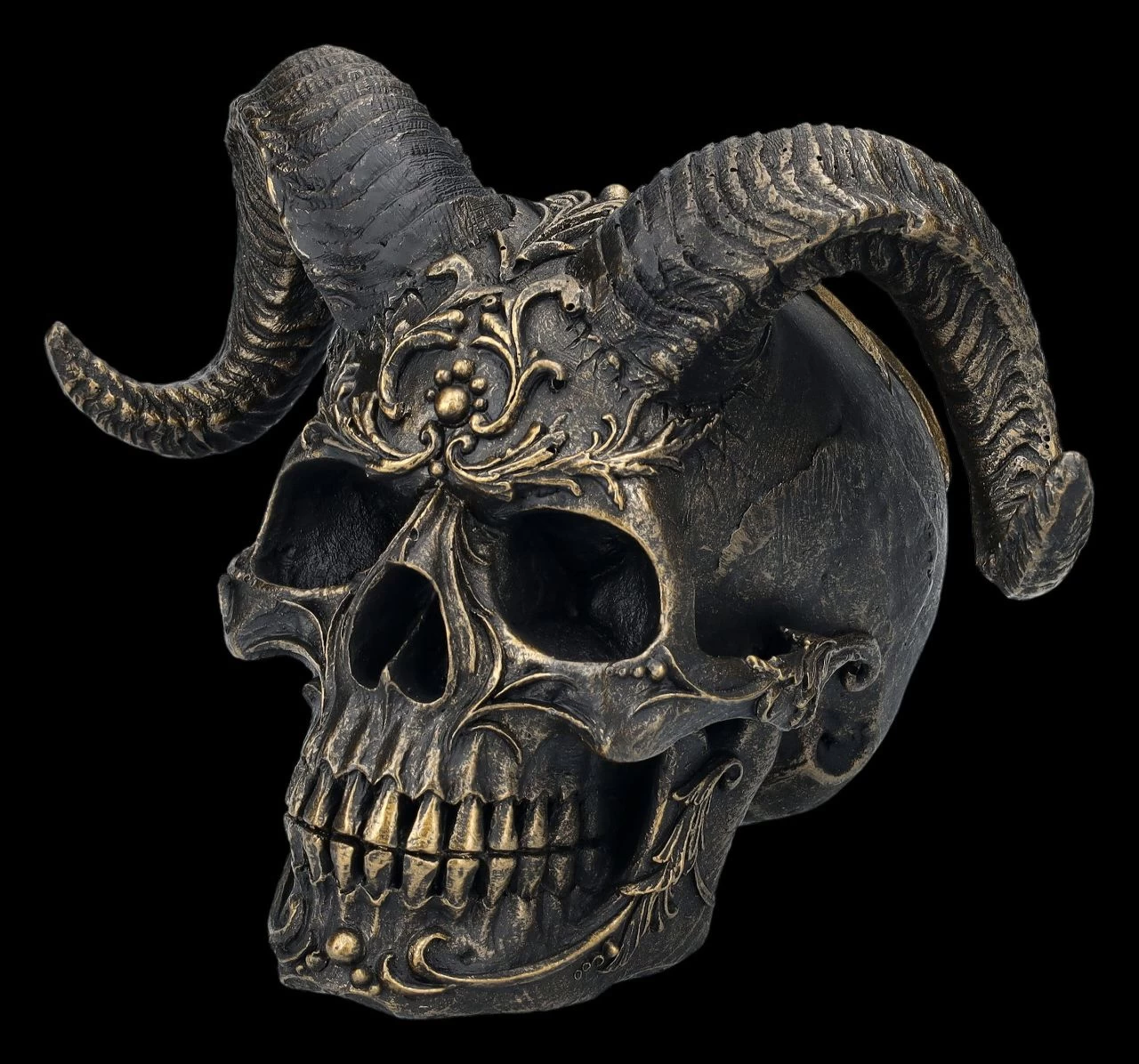 Beinahe barock mutet dieser sehr dekorativ verzierte Totenschädel des Gehörnten an. Die 13 cm hohe, 18 cm breite und 14 cm tiefe ungewöhnliche Totenkopf-Figur mit den Hörnern wurde detailreich aus sorgfältig handbemaltem Kunststein (Polyresin) gegossen. Diabolus ist eine dämonische, aber auch absolut magische Deko und das nicht nur bei einer Horror-Motto-Party oder an Halloween. Dieser Totenschädel mit den Hörnern wird auch auf jedem Altar garantiert zum sofortigen Blickfang.