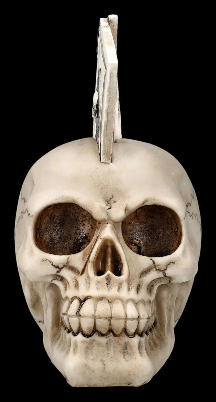 Pokerkarten für den nächsten Pokerabend? Auch wenn einen dann immer noch jemand übertrumpfen kann – vielleicht bringt dieser Totenkopf mit den 4 Assen im Schädel doch Glück. Denn immerhin bedeutet ‚Four of a Kind‘, also die vier Asse in der Hand, mehr als ‚Full House‘. Auf jeden Fall ist der 19 cm hohe, 10,5 cm breite und 19,5 cm tiefe Schädel aus handbemaltem Kunststein (Polyresin) mit den 4 Assen als Iro eine tolle Deko. Für Sammler oder auch leidenschaftliche Spieler ist er auch ein perfektes Geschenk.
