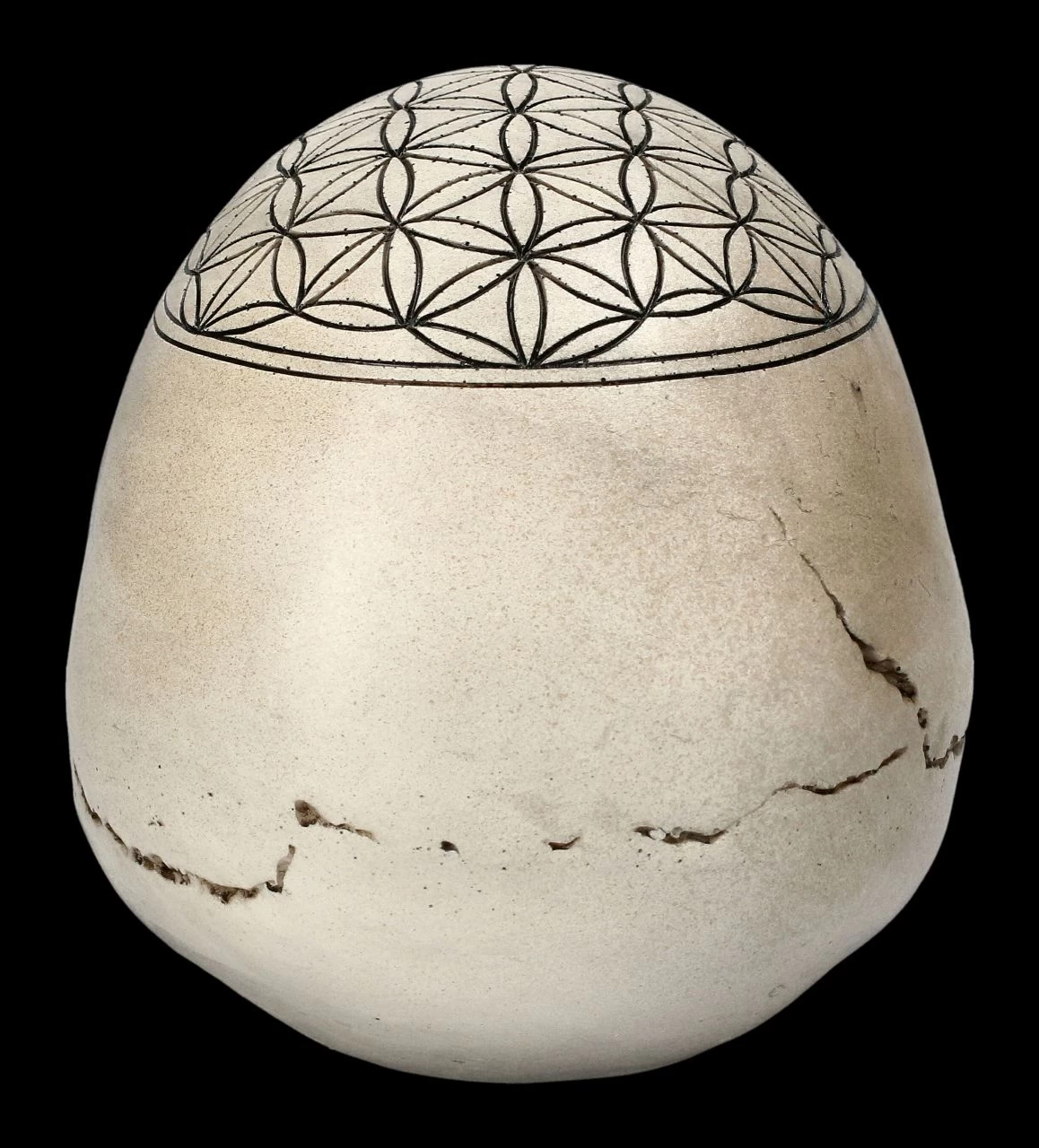 Die Heilige Geometrie gilt als Fundament für alles Lebendige. Jedes Symbol hat seine eigene Wirkung und Energie, die genutzt werden kann, um positive Gefühle und auch Ideen zu fördern. Das gilt insbesondere für die Blume des Lebens, die seit ewigen Zeiten als Energiesymbol bekannt ist und vor allem für die symbolische Darstellung der kosmischen Ordnung steht. Ausgerechnet die Blume des Lebens ist auf dem Haupt dieses in natürlichen Knochen-Farben handbemaltem Totenkopf aus Kunststein (Polyresin) zu sehen. Aber mit diesem magischen, 12,5 cm hohen, 11,2 cm breiten und 16 cm tiefen Totenkopf holen Sie sich die Energie der Blume des Lebens in etwas ungewöhnlicher Form in Ihr Heim. Weitere Totenköpfe mit Formen aus der Heiligen Geometrie finden Sie in unserem Shop.