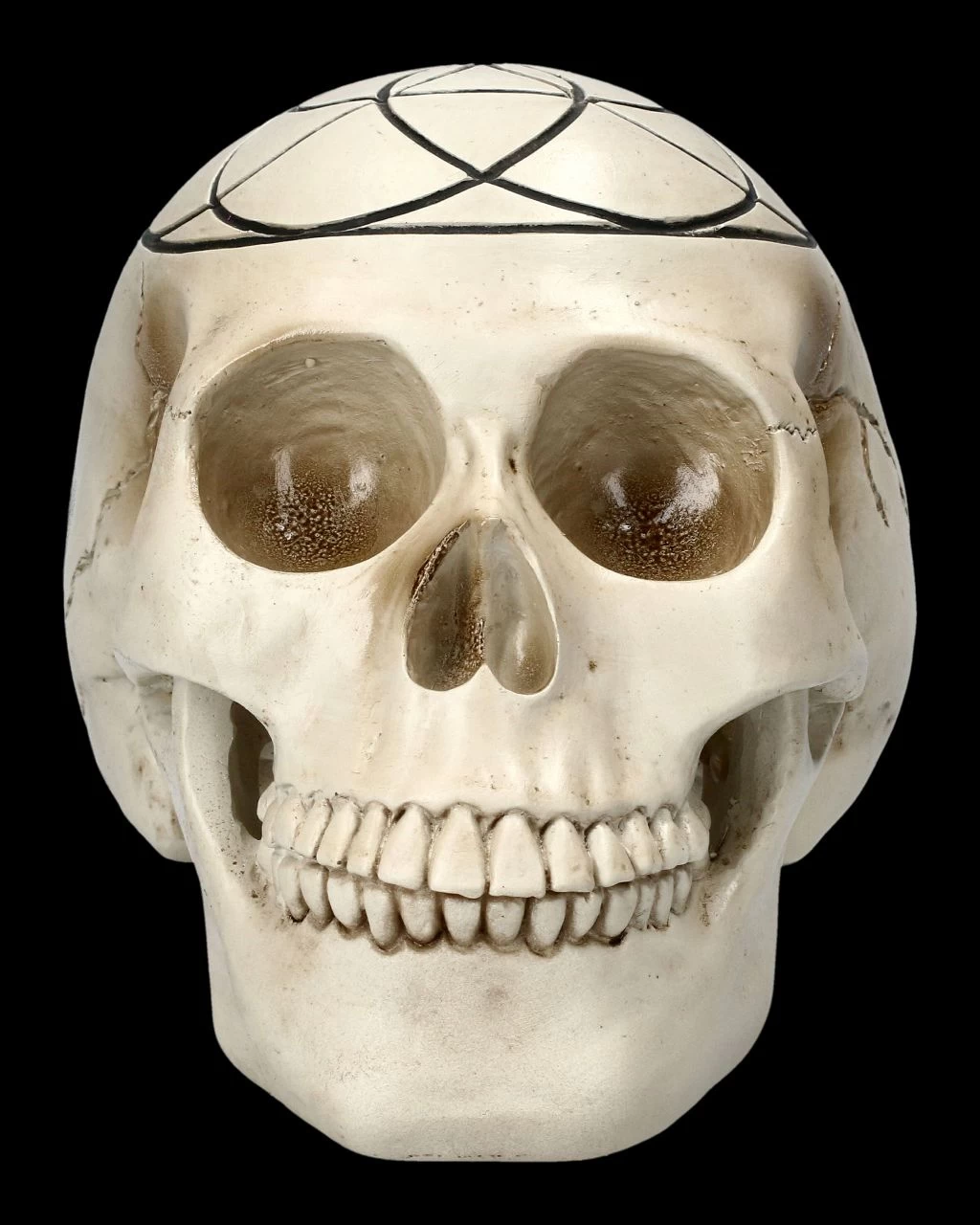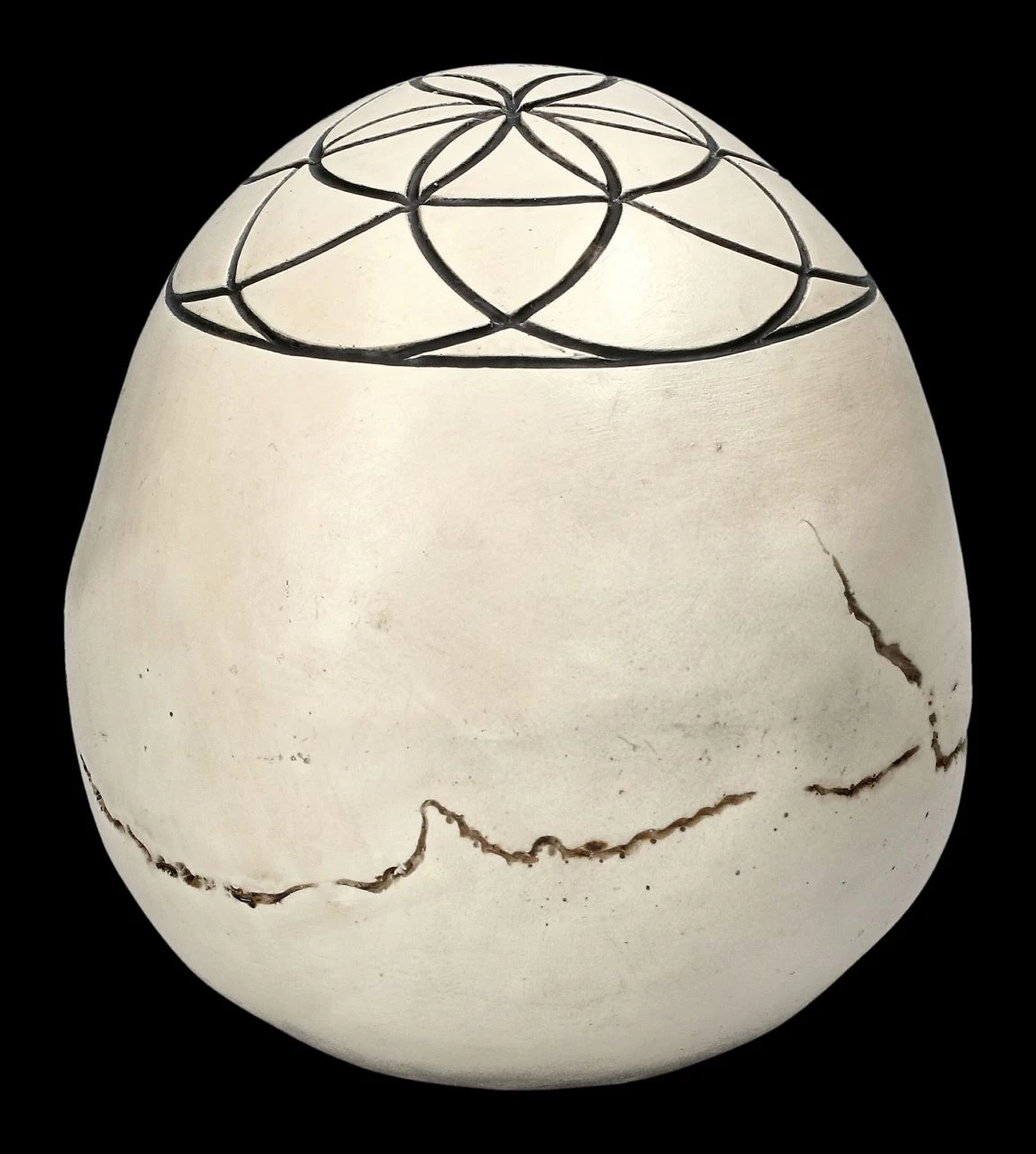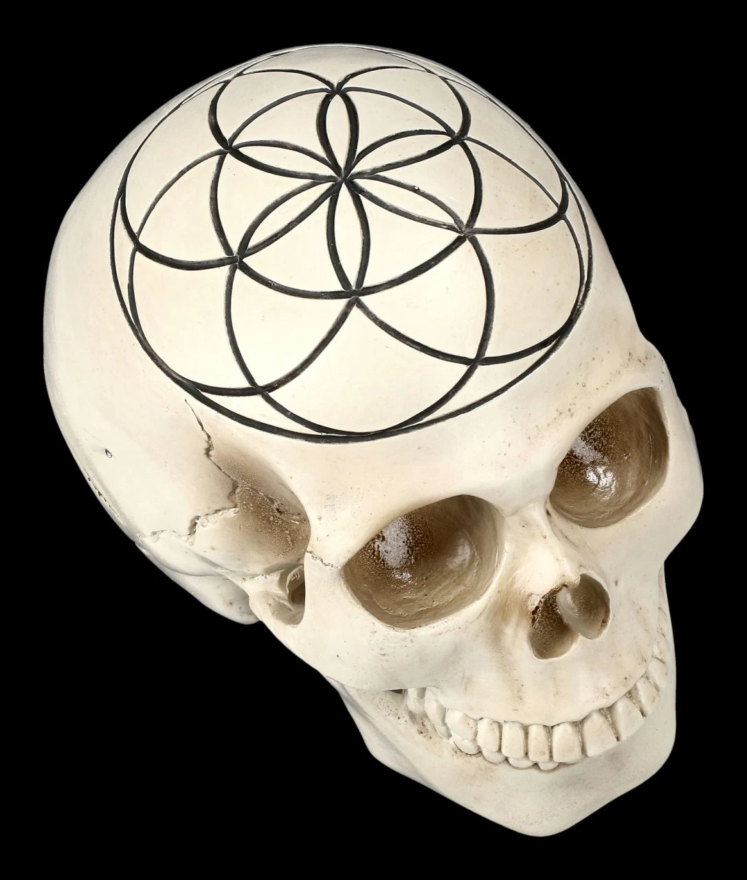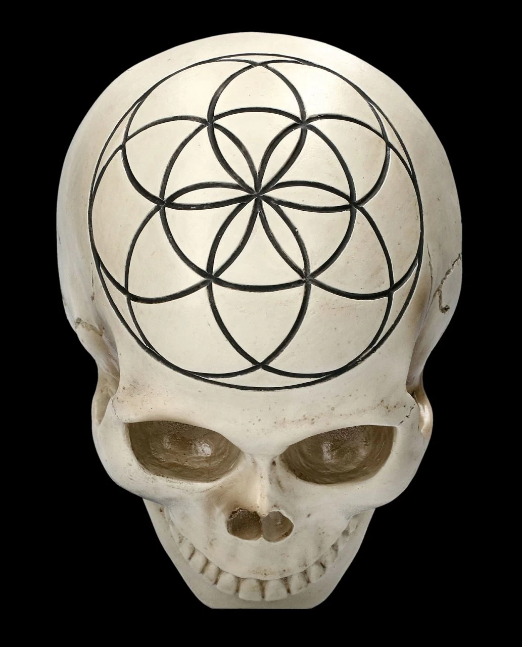 Die Heilige Geometrie gilt als Fundament für alles Lebendige. Jedes Symbol hat seine eigene Wirkung und Energie, die genutzt werden kann, um positive Gefühle und auch Ideen zu fördern. Der Same oder die Saat des Lebens bildet den Mittelpunkt der Blume des Lebens, die eines der bekanntesten und wichtigsten Energiesymbole ist, denn sie steht für Harmonie, Heilung und Genesung. Dass der Samen des Lebens ausgerechnet auf dem Haupt dieses in natürlichen Knochen-Farben handbemaltem Totenkopf aus Kunststein (Polyresin) zu sehen ist, mag vielleicht ungewöhnlich zu sein, ist aber nur konsequent. Mit diesem fantastischen 12,5 cm hohen, 11,2 cm breiten und 16 cm tiefen Totenkopf holen Sie sich die Energie und die Kraft der Heiligen Geometrie in etwas ungewöhnlicher Form in Ihr Heim oder in Ihr Studio..Weitere Totenköpfe mit Formen aus der Heiligen Geometrie finden Sie in unserem Shop.