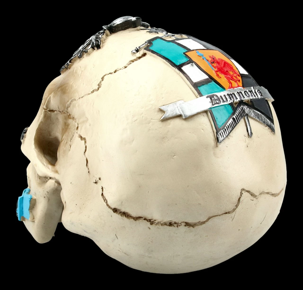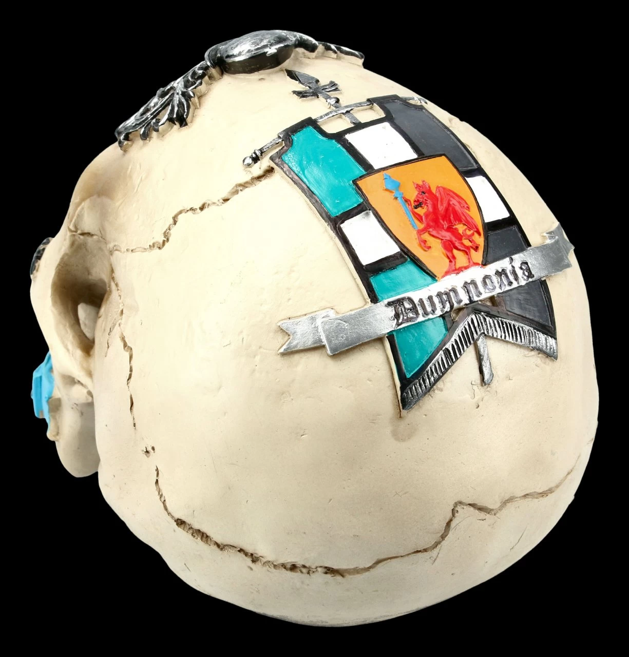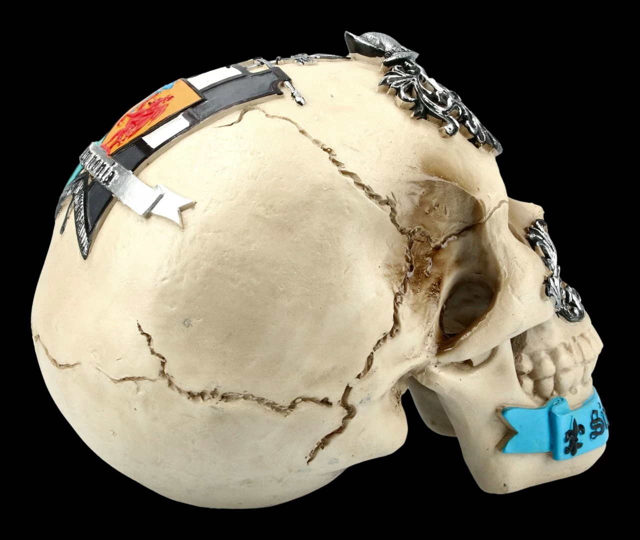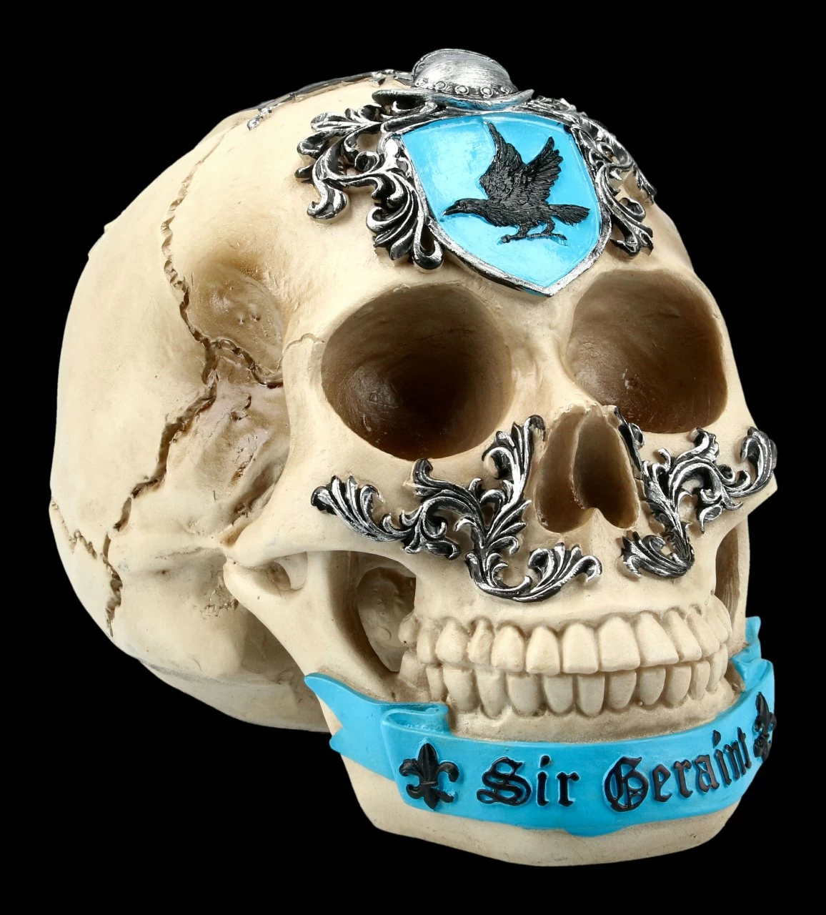 Einer der Ritter an König Arthurs Tafelrunde war Sir Geraint, auch bekannt aus der Legende von Erec und Enid. Er war der älteste Sohn des Königs von Dumnonia. Das geht auch aus der Flagge mit Schriftband auf der Schädelbasis dieses ungewöhnlichen Totenkopfes hervor. Das Wappen auf der Stirn dieses ausgefallenen Totenschädels zeigt einen schwarzen Raben auf blauem Grund. Auf dem blauen Schriftband am Kinn steht der Name von ‚Sir Geraint‘. Der Deko Totenschädel von Sir Geraint ist mit silberfarbenen Ornamenten verziert und hat eine Höhe von 13,5 cm, eine Breite von 12 cm und eine Tiefe von 16,5 cm. Er ist sehr detailreich aus Kunststein (Polyresin) gefertigt und sorgfältig von Hand bemalt.
