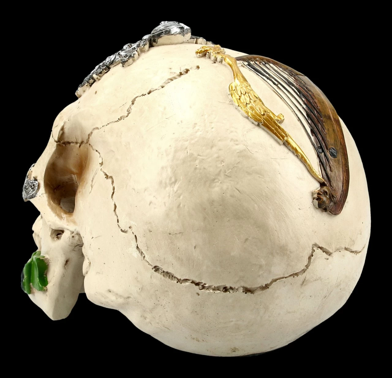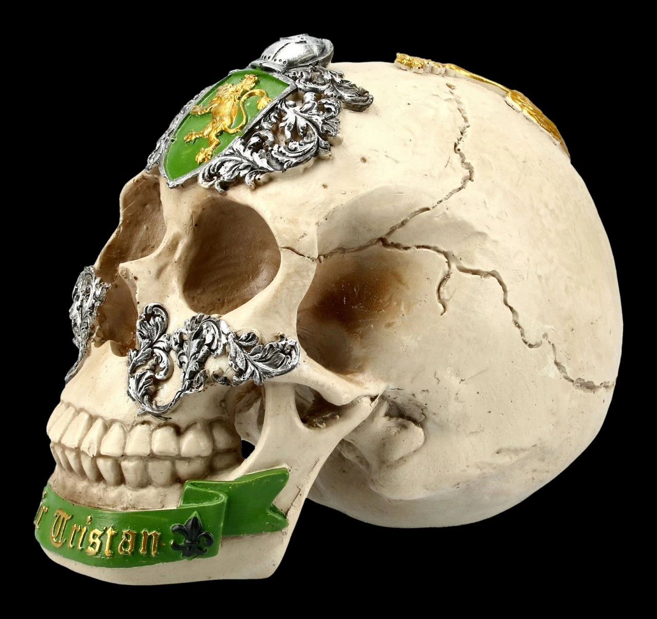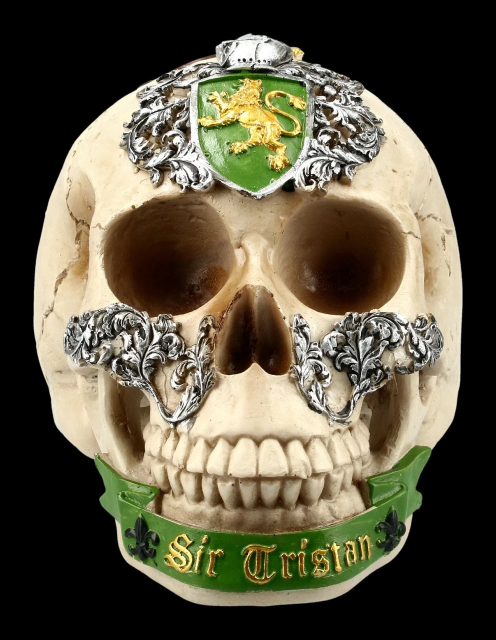 Der Ritter Sir Tristan gehörte zu den zwölf Rittern an der Tafelrunde von König Arthur. Das Wappen auf der Stirn dieses ausgefallenen Totenschädels, der goldene Löwe auf grünem Grund und das grüne Band und dem Schriftzug ‚Sir Tristan‘ zeigt, dass er in den Sagen um König Arthur ein keltischer Ritter war. Er war bekannt für seine Dichtkunst und sein Harfenspiel und eine goldene Harfe ist auch auf der Schädelbasis angebracht. Der außergewöhnliche, mit silberfarbenen Ornamenten verzierte Totenkopf hat eine Höhe von 13,5 cm, eine Breite von 12 cm und eine Tiefe von 16,5 cm. Er ist sehr detailreich aus Kunststein (Polyresin) gefertigt und sorgfältig von Hand bemalt.
