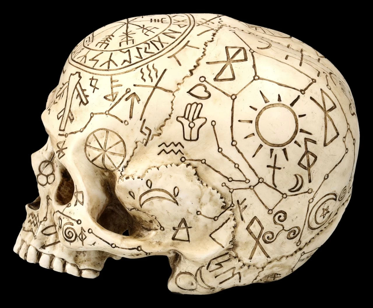 Mit zahlreichen Symbolen ist dieser mystische Ritualschädel verziert. Der handbemalte Schädel aus der Studio Collection von Veronese wurde außerordentlich detailreich aus Kunststein (Polyresin) gefertigt. Mit der Höhe von 13 cm, der Breite von 12,5 cm und der Tiefe von 18 cm wird er so zum Mittelpunkt auf jedem Altar.