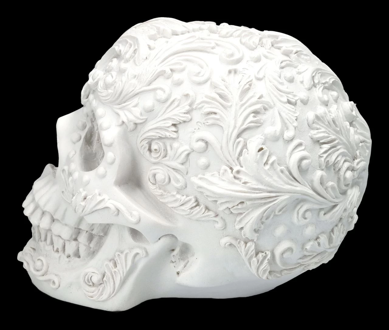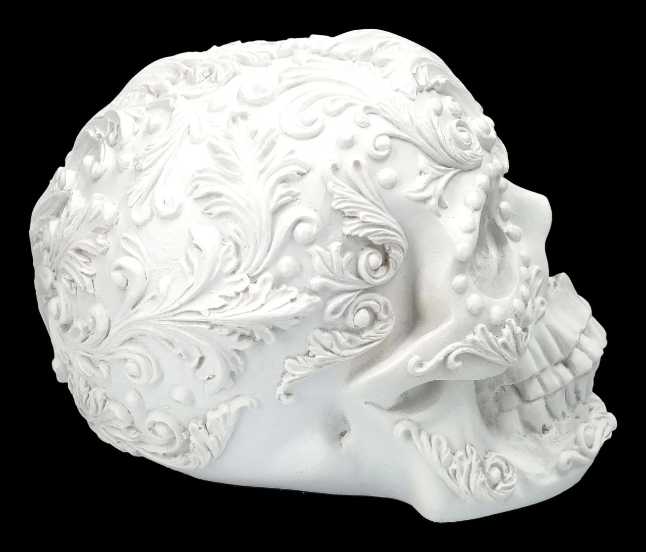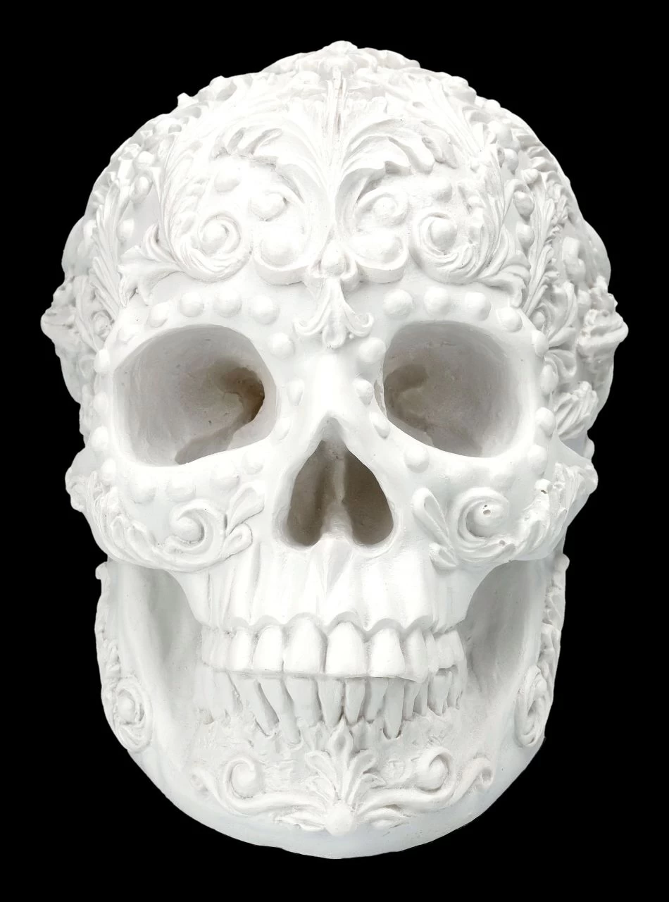 Die verschwenderischen Verzierungen des Barockstiles wurden später in Rokoko weiter entwickelt. Der Dreißigjährige Krieg und die Pestepedemien haben, zumindest die wohlhabenden, Menschen dazu veranlasst, das Leben zu genießen. Bei den Festtafeln war es durchaus üblich, auch geschnitzte Totenschädel, z.B. aus Zuckerguss, in die Dekoration einzuarbeiten. Und wie geschnitzt oder aus Zuckerguss gefertigt wirkt auch dieser faszinierende weiße 16,5 cm hohe, 15 cm breite und 22 cm tiefe von Hand bemalte Schädel aus Kunststein (Polyresin). Er ist eine perfekte Dekoration für jedes Ambiente, wird aber auch bei jeder Halloween-Party zum Mittelpunkt einer Tafel.