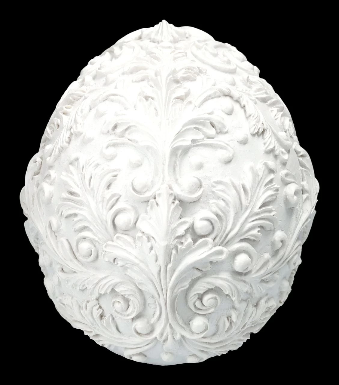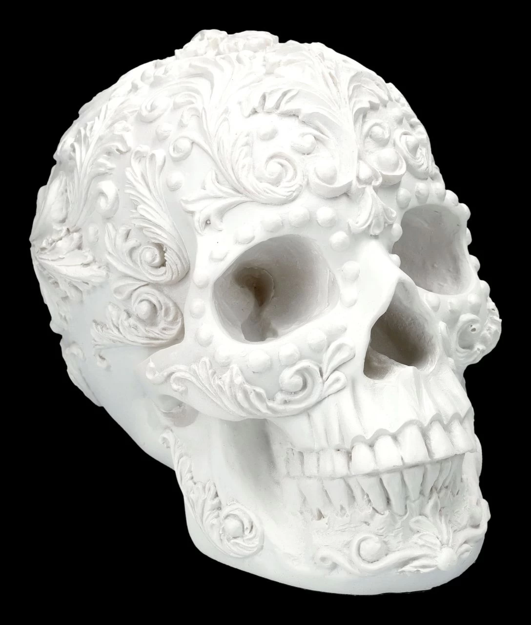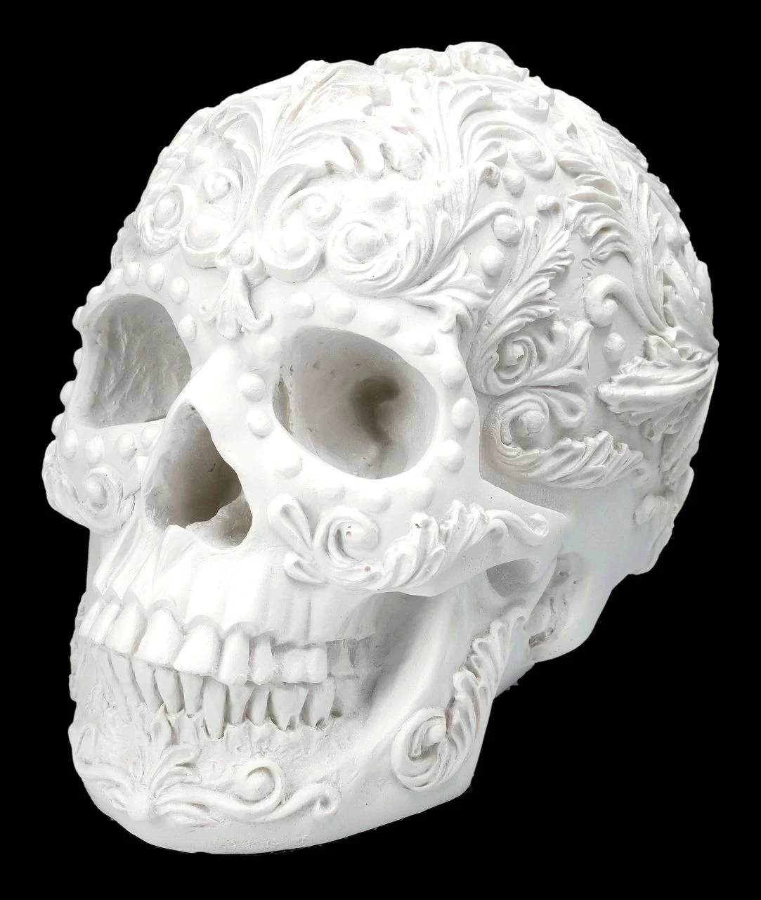 Die verschwenderischen Verzierungen des Barockstiles wurden später in Rokoko weiter entwickelt. Der Dreißigjährige Krieg und die Pestepedemien haben, zumindest die wohlhabenden, Menschen dazu veranlasst, das Leben zu genießen. Bei den Festtafeln war es durchaus üblich, auch geschnitzte Totenschädel, z.B. aus Zuckerguss, in die Dekoration einzuarbeiten. Und wie geschnitzt oder aus Zuckerguss gefertigt wirkt auch dieser faszinierende weiße 16,5 cm hohe, 15 cm breite und 22 cm tiefe von Hand bemalte Schädel aus Kunststein (Polyresin). Er ist eine perfekte Dekoration für jedes Ambiente, wird aber auch bei jeder Halloween-Party zum Mittelpunkt einer Tafel.