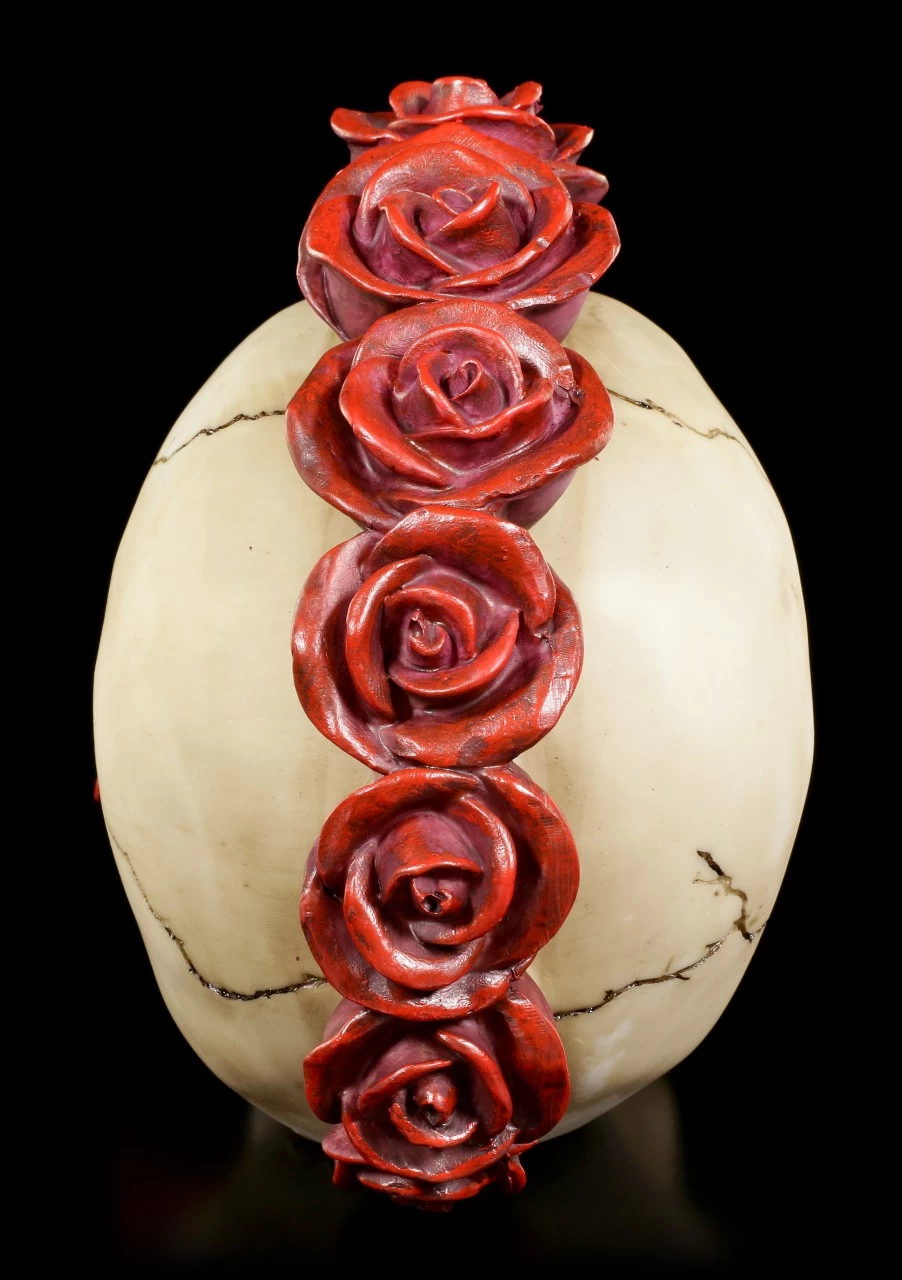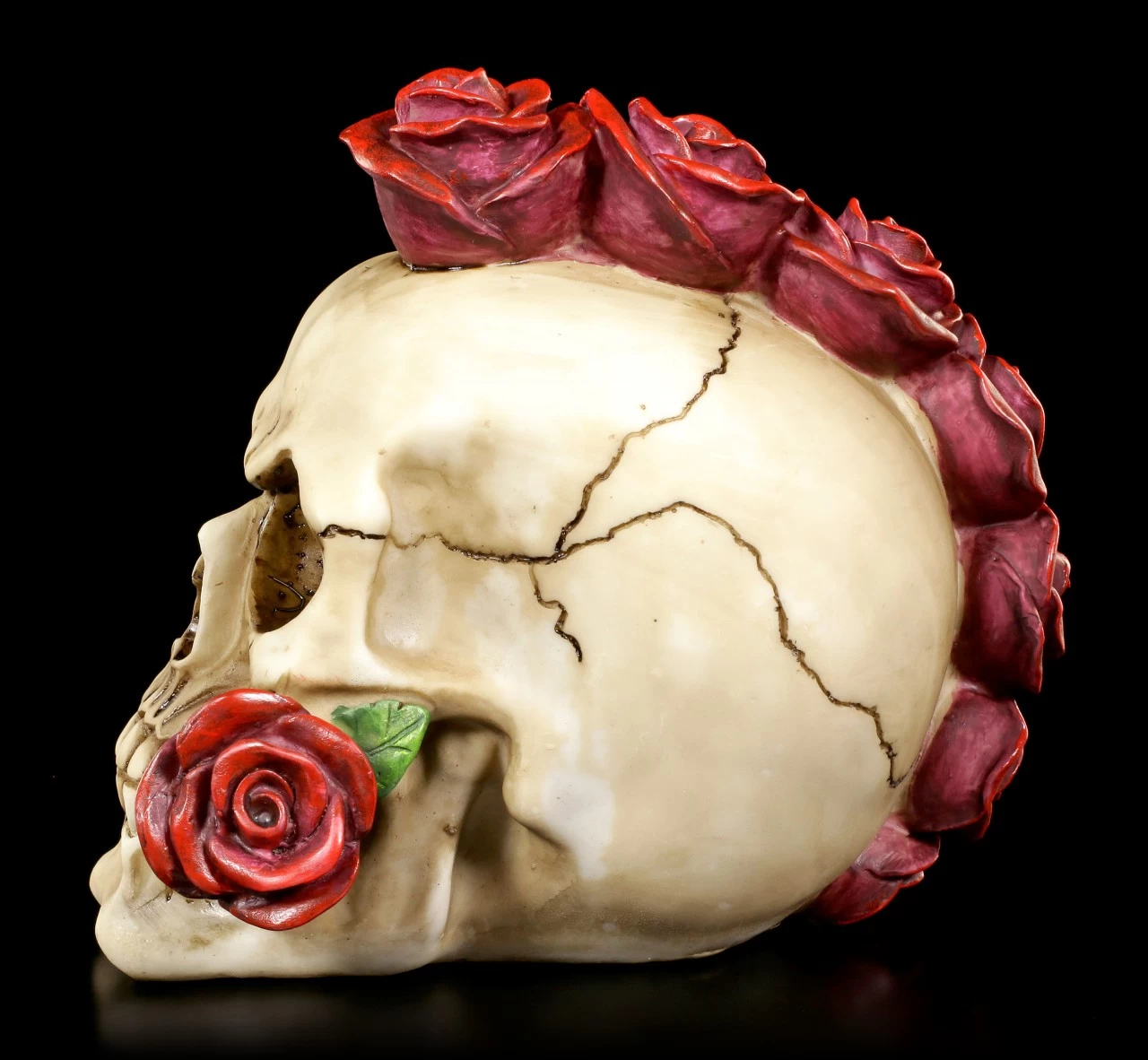 Dieser Totenkopf ist was ganz Besonderes und wird zu dem Blickfang auf jedem Tisch. Aus leeren Augenhöhlen scheint er den Betrachter direkt anzustarren und hält dabei eine rote Rose zwischen seinen Zähnen. Dieses düstere Zeichen der menschlichen Vergänglichkeit steht im Kontrast zu den farbenfrohen roten Rosen, die ihm eine gewisse Lebendigkeit schenken. Aber auch sie verwelken und erinnern uns daran, dass alles vergeht und nichts für immer bleibt.