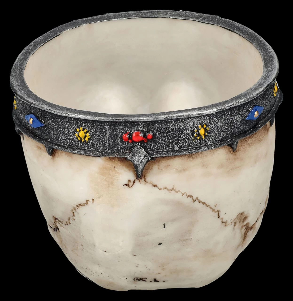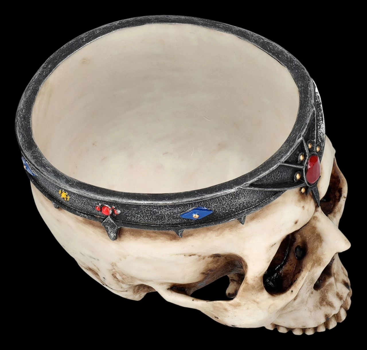 Der edel verzierte Reif, der die Stirn dieses Totenkopfs schmückt, weist ihn als königlichen Schädel aus. Als Blumentopf bzw. Übertopf gibt der 12 cm hohe, 13 cm breite und 17 cm tiefe Schädel jeder Pflanze einen königlichen Rahmen. Der königliche Schädel ist sehr detailreich aus handbemaltem Kunststein (Polyresin) gefertigt und kann eine Pflanze mit dem Durchschnitt bis 11 cm aufnehmen. Da er kein Ablaufloch hat, kann dieser dekorative Schädel sicher auch andere Dinge, wie Schmuck, Stifte, oder was auch immer, aufnehmen. Der Fantasie sind keine Grenzen gesetzt. Unsere Dekoration ist nicht in der Lieferung enthalten.