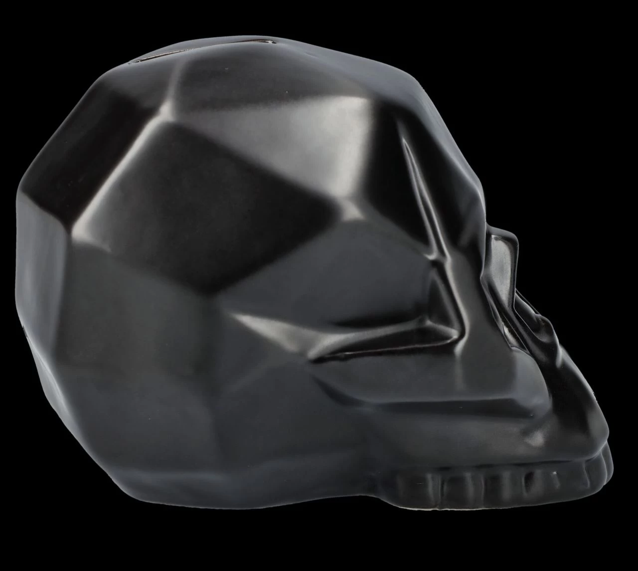 Beinahe wie ein Kunstobjekt wirkt dieser minimalistische schwarze Totenkopf. Dass sich dahinter eine Spardose befindet, wird sicherlich nicht vermutet, daher ist dieser Totenkopf aus Keramik der perfekte Schatzhüter. Die ungewöhnliche Spardose ‚Geometrie‘ ist 11 cm hoch, 11 cm breit und 16 cm tief und hat am Boden eine Entnahmeöffnung. Der schwarze glänzende Totenkopf ist – ob mit Inhalt oder ohne – auch ein perfektes Geschenk.