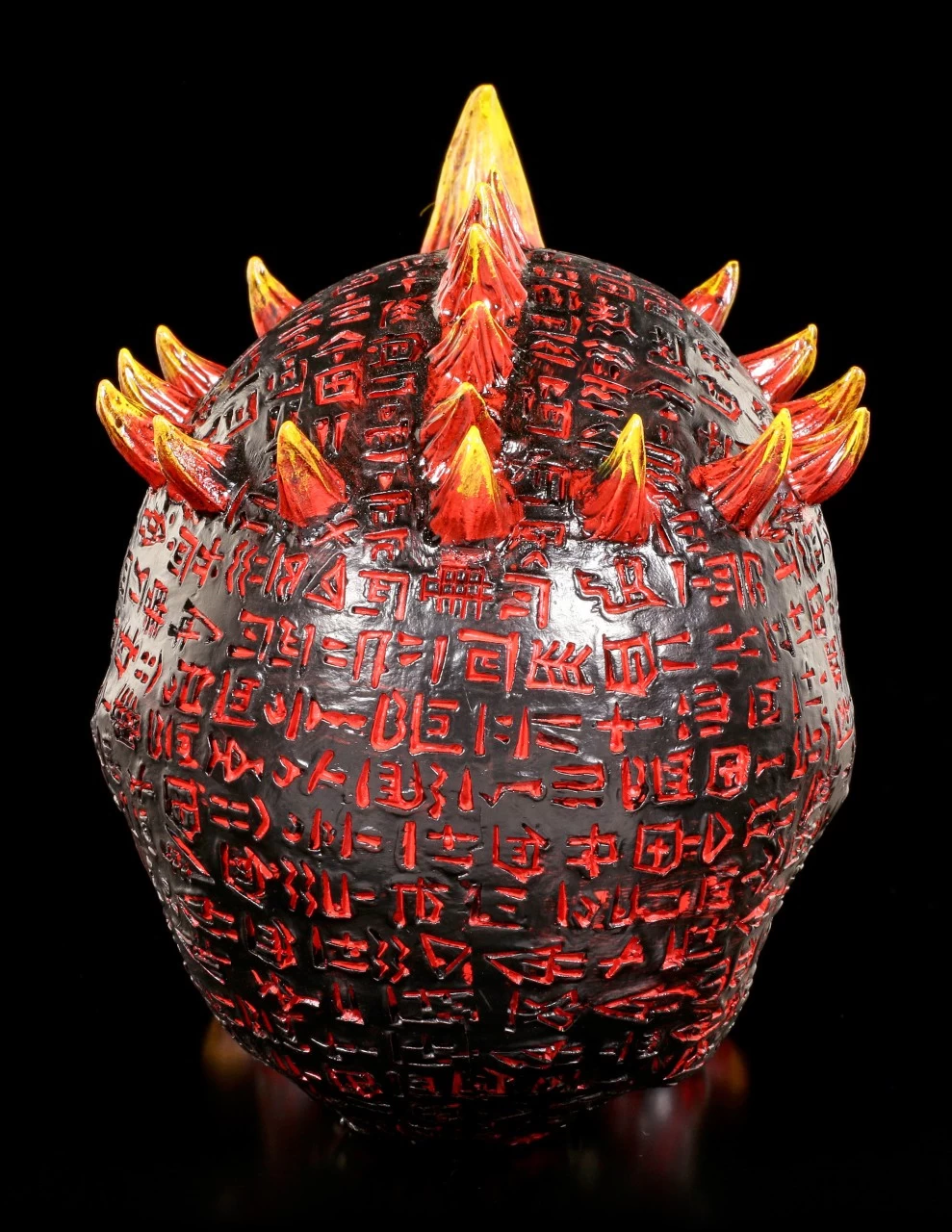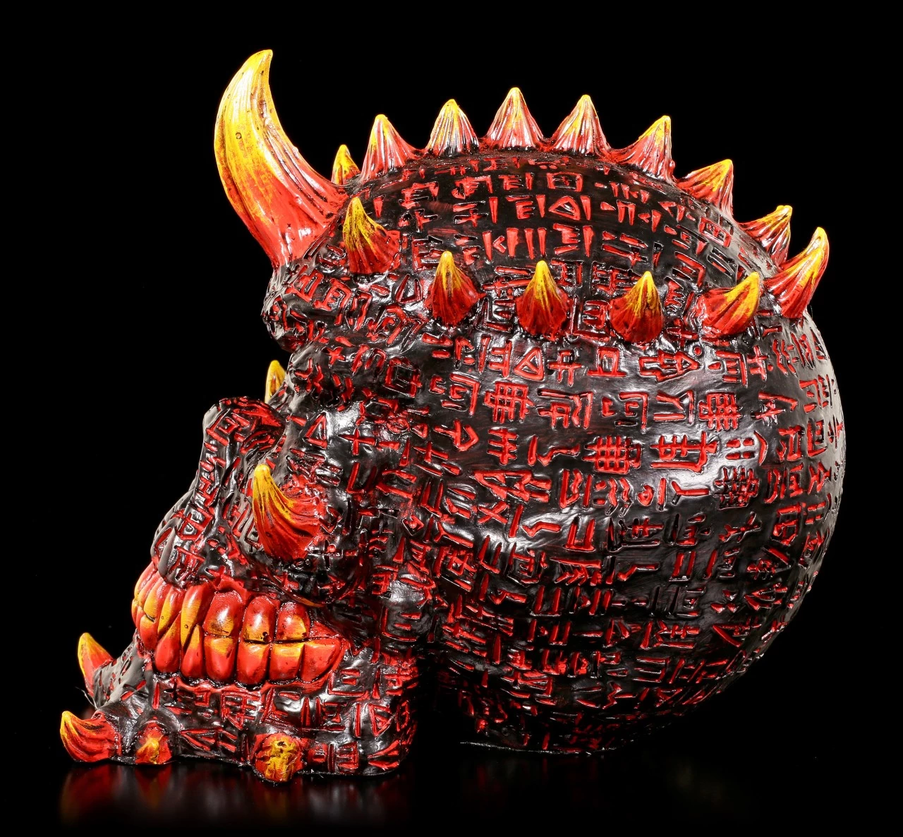Der mit mystischen Symbolen übersähte teuflische Zyklopen Schädel von Derek W. Frost wird Ihre Besucher begeistern. Der Kunststein Totenkopf wurde detailreich und farbintensiv handbemalt.