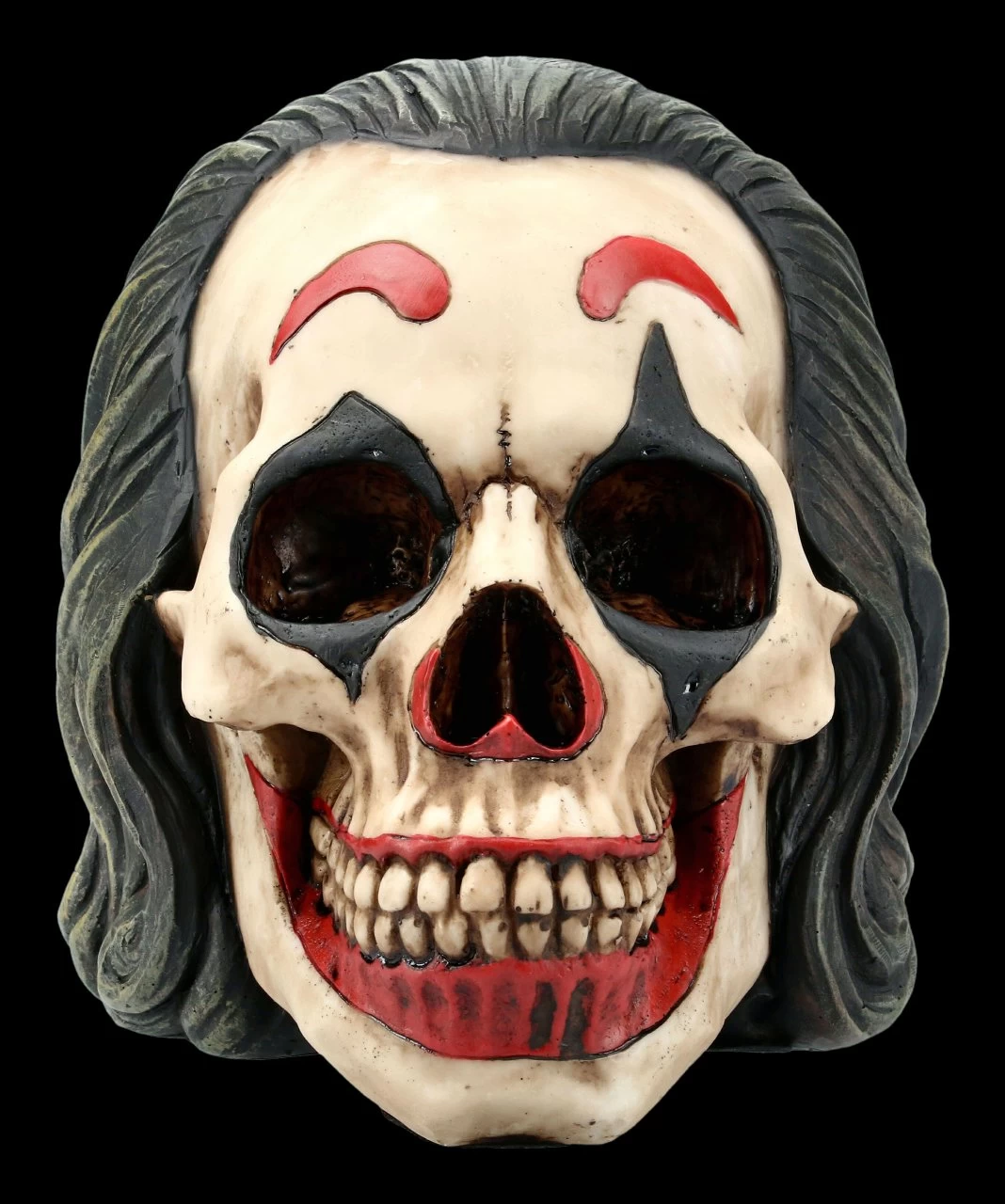 Ob Sie mit dem Totenkopf The Joker auf Ihrem Schreibtisch die Kolleginnen und Kollegen zum Lachen oder zum Gruseln bringen, bleibt abzuwarten. Aber sicher wird der aus handbemaltem Kunststein (Polyresin) gefertigte tolle Clowns Schädel alle Blicke auf sich ziehen. Der Joker Schädel ist 15,5 cm hoch, 14 cm breit und 16 cm tief. Er ist auf jeden Fall ein witziges Accessoire für den Büroalltag.