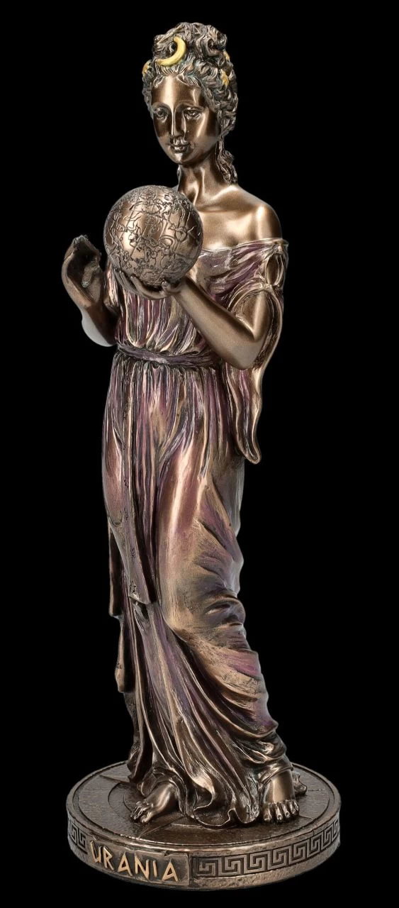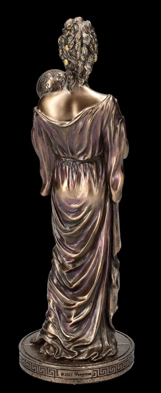 Urania, die Göttin der Sternkunde, gehört in der Griechischen Mythologie zu den neun Musen. Ihr Name wird von Uranos, dem Himmelsgott, abgeleitet. Diese faszinierende und wunderbare Skulptur aus der Studio Collection von Veronese zeigt Urania, wie sie nachdenklich die Erdkugel in ihrer Hand betrachtet. Bis zu den mit Mond und Sternen geschmückten Haaren, dem in fließenden Falten fallenden Kleid, auf dem ebenfalls Sterne zu sehen sind und der feinen Mimik ist diese edel bronzierte und raffiniert fein colorierte Skulptur wunderbar detailreich aus hochwertigem Kunststein (Polyresin) entstanden. Sie ist ein wunderbarer und effektvoller Blickfang und für alle, die sich für die Götterwelt der alten Griechen interessieren, ist die 22,5 cm hohe, 8 cm breite und 8 cm tiefe Urania-Skulptur ein perfektes Geschenk. Sammler finden in unserem Shop übrigens weitere faszinierende Götter-Figuren von Veronese.
