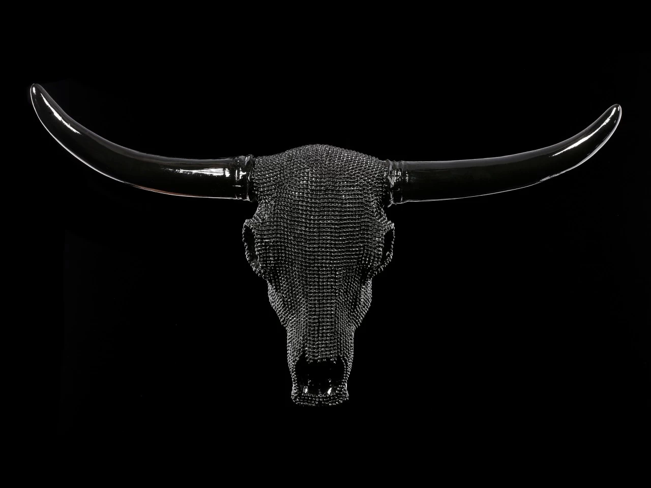 Der handbemalte, schwarze Büffel Schädel aus Kunststein (Polyresin) mit glänzenden Hörnern ist über und über mit kleinen Noppen verziert, welche wie Kristalle wirken. Der Totenkopf ist eine wunderbare Wanddeko – nicht nur für jeden Western Fan. Der Schädel kann zu dekorativen Zwecken auch auf ein Sideboard gelegt werden und besticht durch die vielen Details.