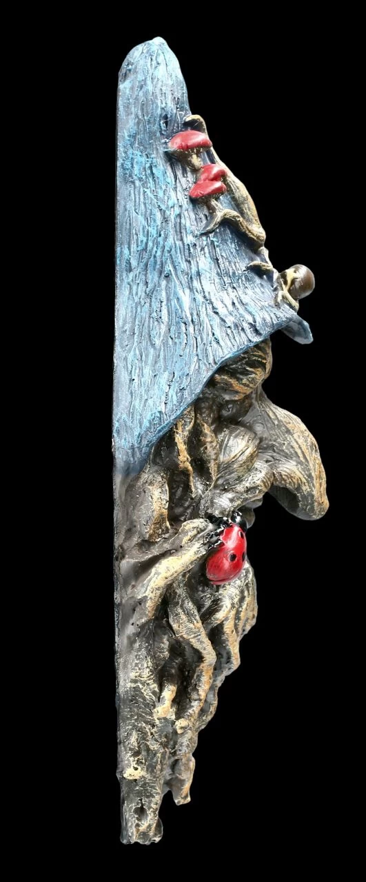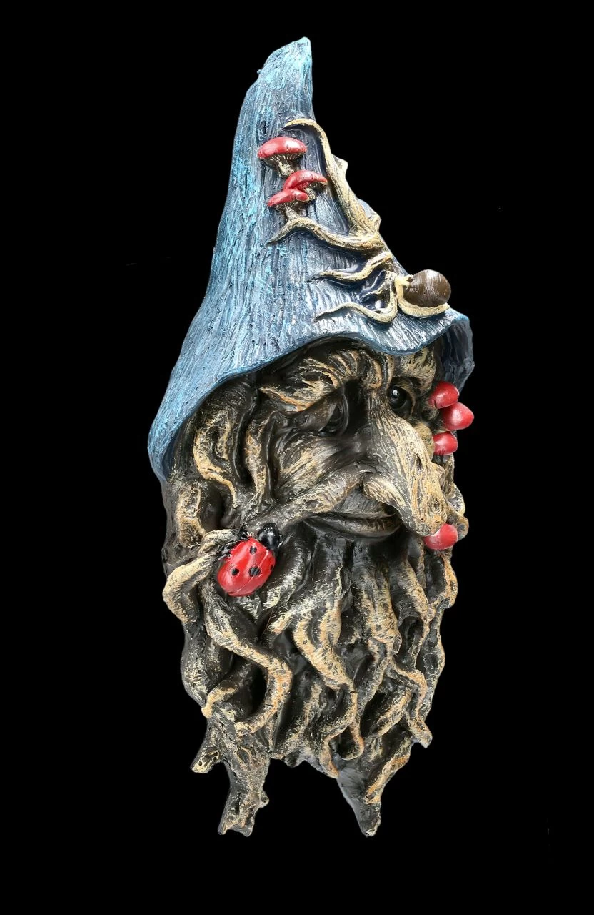Entrückt lächelnd blickt der Greenman Magier Gwydion von Ihrer Wand auf die Bewohner..Als schützender Waldgeist behütet er die Natur, aber auch Ihr Heim. Der blaue Hut, der Bart und die roten Pilze geben ihm eine magische Note Das Relief aus handbemaltem Kunststein (Polyresin).ist 31,0 cm hoch, 15,0 cm cm breit und 8,0 cm tief und bringt Ihrer Wohnung den Schutz der Natur.