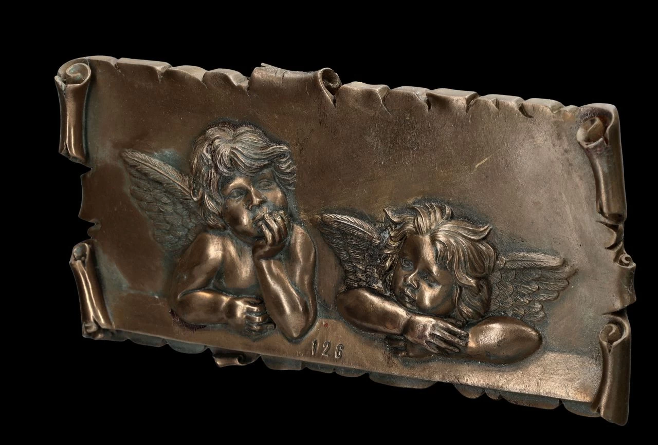 Jeder kennt dieses Motiv. Aber auf diesem Wandrelief zeigt es auch, dass Engel für jeden da sind. Das wie eine Schriftrolle geformte Wandrelief mit den nachdenklichen Putten ist 9,5 cm hoch, 19 cm breit und 2 cm tief. Es wurde aus bronziertem Kunststein (Polyresin) gefertigt und ist auch ein wunderbares und beschützendes kleines Geschenk.