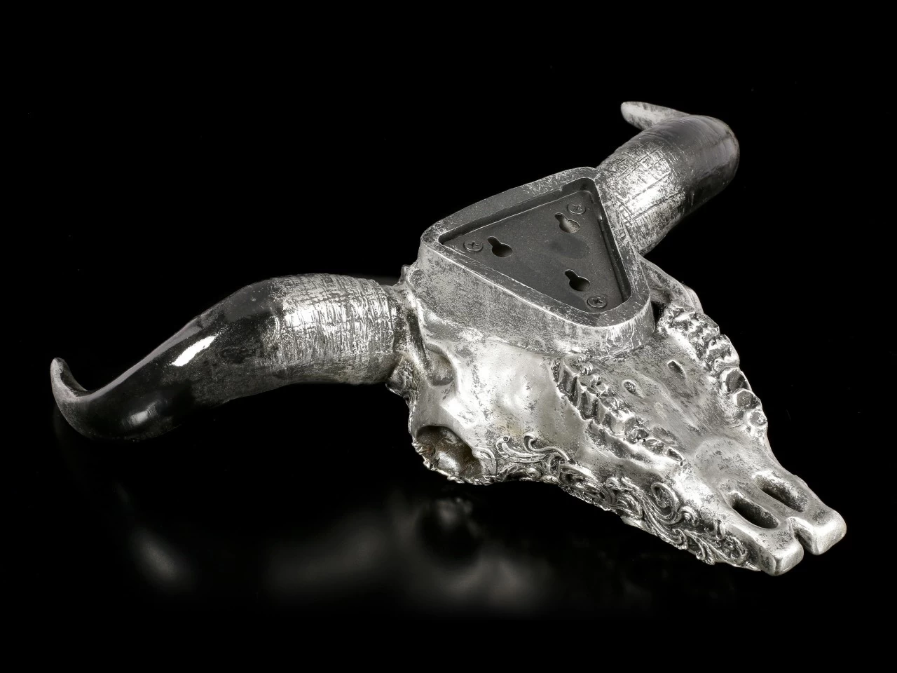 Sind Sie auf der Suche nach einer ungewöhnlichen Wanddeko? Dann ist der silberfarbene Stierschädel aus handbemaltem Kunststein (Polyresin) perfekt für Sie! Der Schädel mit Drachenmotiv lässt sich auch dekorativ auf einem Sideboard platzieren.