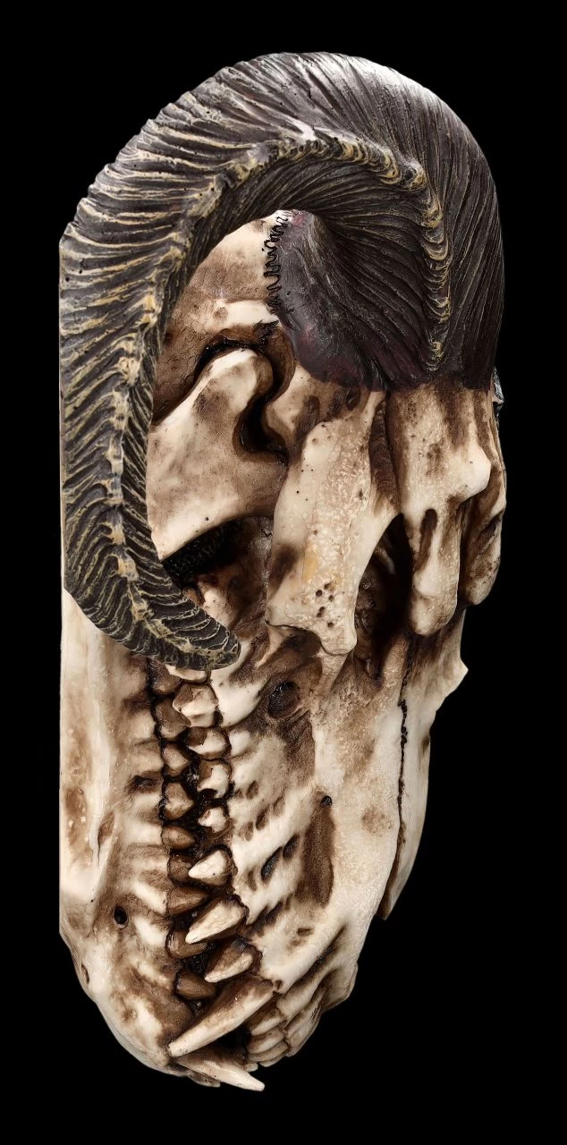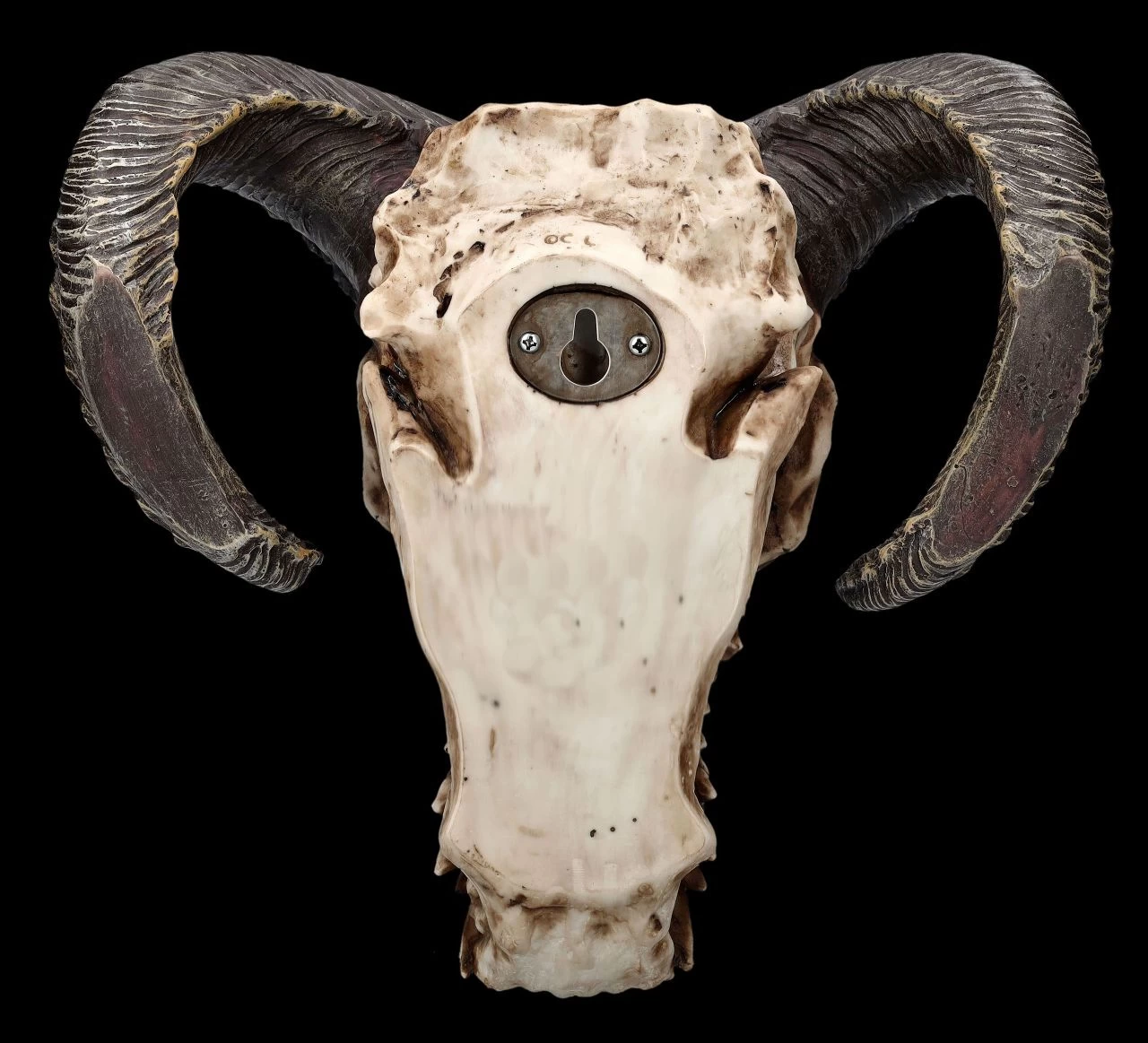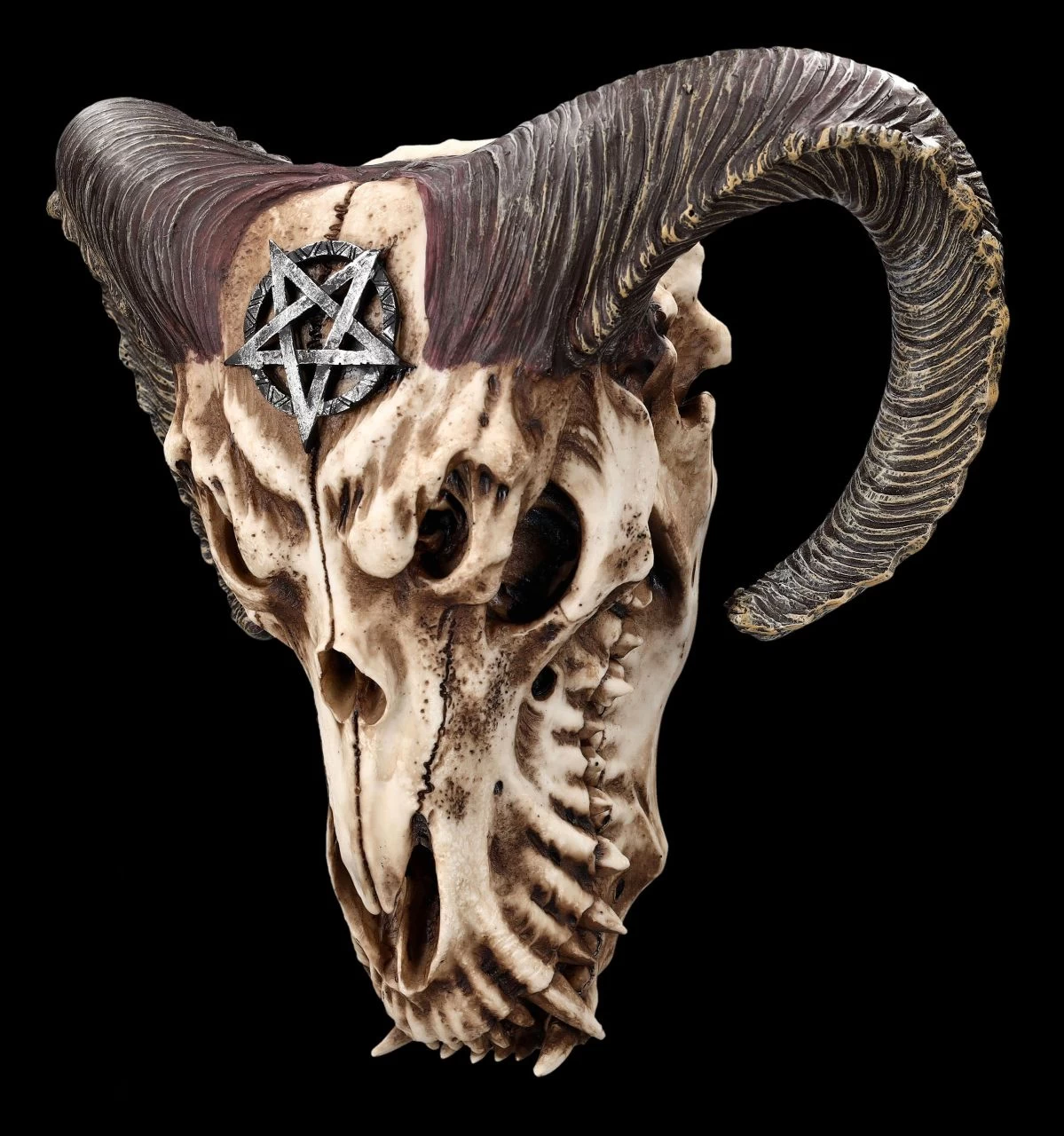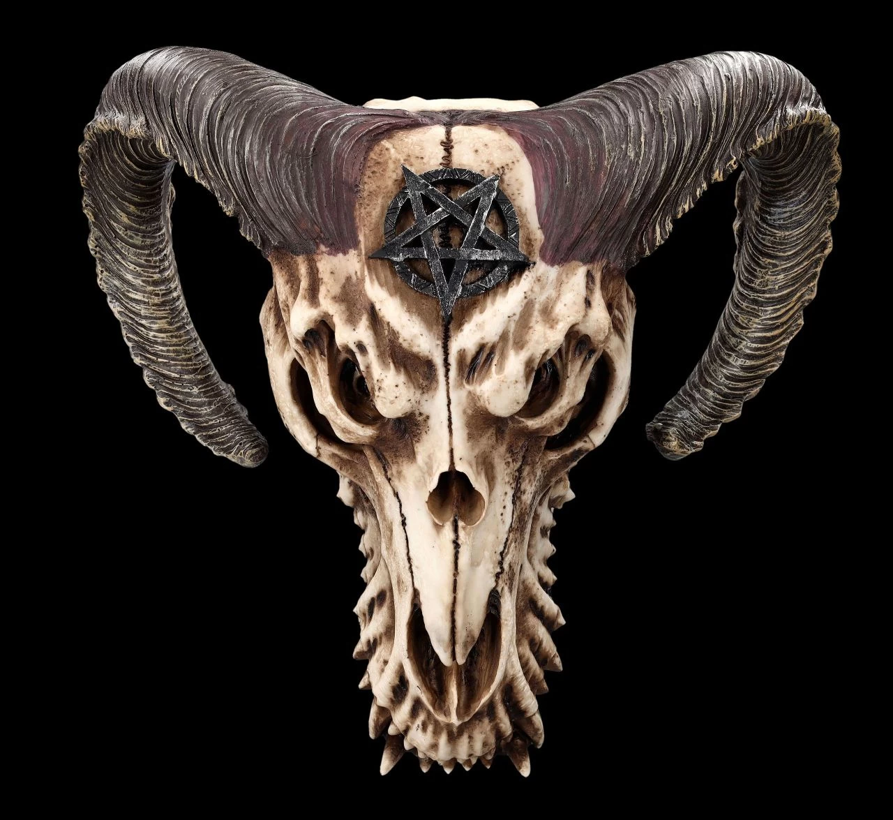 Ob an die Wand gehängt, oder auf einem Sideboard aufgestellt – dieser furchteinflösende Dämonen Schädel eines Widders wird mit Sicherheit Ihren Besuchern entweder Schrecken einjagen, oder man wird ihn mit Hochachtung bewundern. Wer ihn bei Ihnen entdeckt, wird auf jeden Fall von seiner detaillierten Darstellung gebannt sein. Der 24 cm hohe, 22 cm breite und 13 cm tiefe Dämonen Schädel wurde sorgfältig und detailreich aus handbemaltem Kunststein (Polyresin) gefertigt. Um die Wirkung zu verstärken, trägt er auf seiner Stirm ein umgekehrtes Pentagramm. Der teuflische Schädel mit dem Pentagramm sollte bei keinem magischen Ritual fehlen.