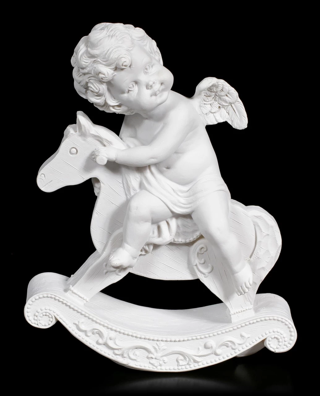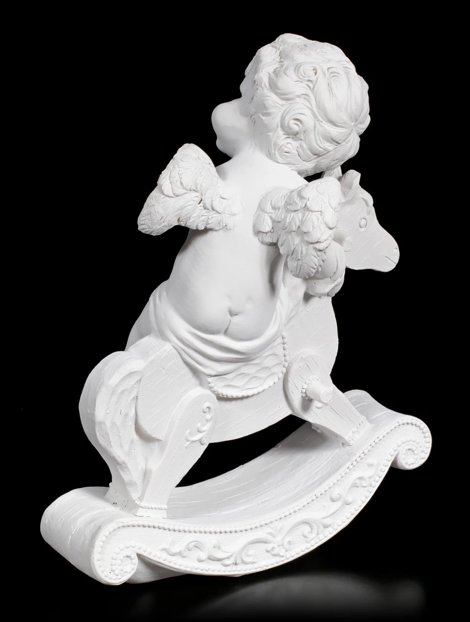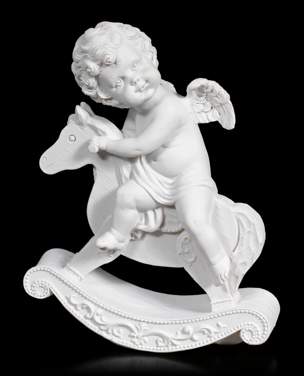 Lustig schaukelt der kleine Cherub auf einem Schaukelpferd. Die Figur wird zu einem liebevollen Dekorationselement in Ihrer Wohnung.