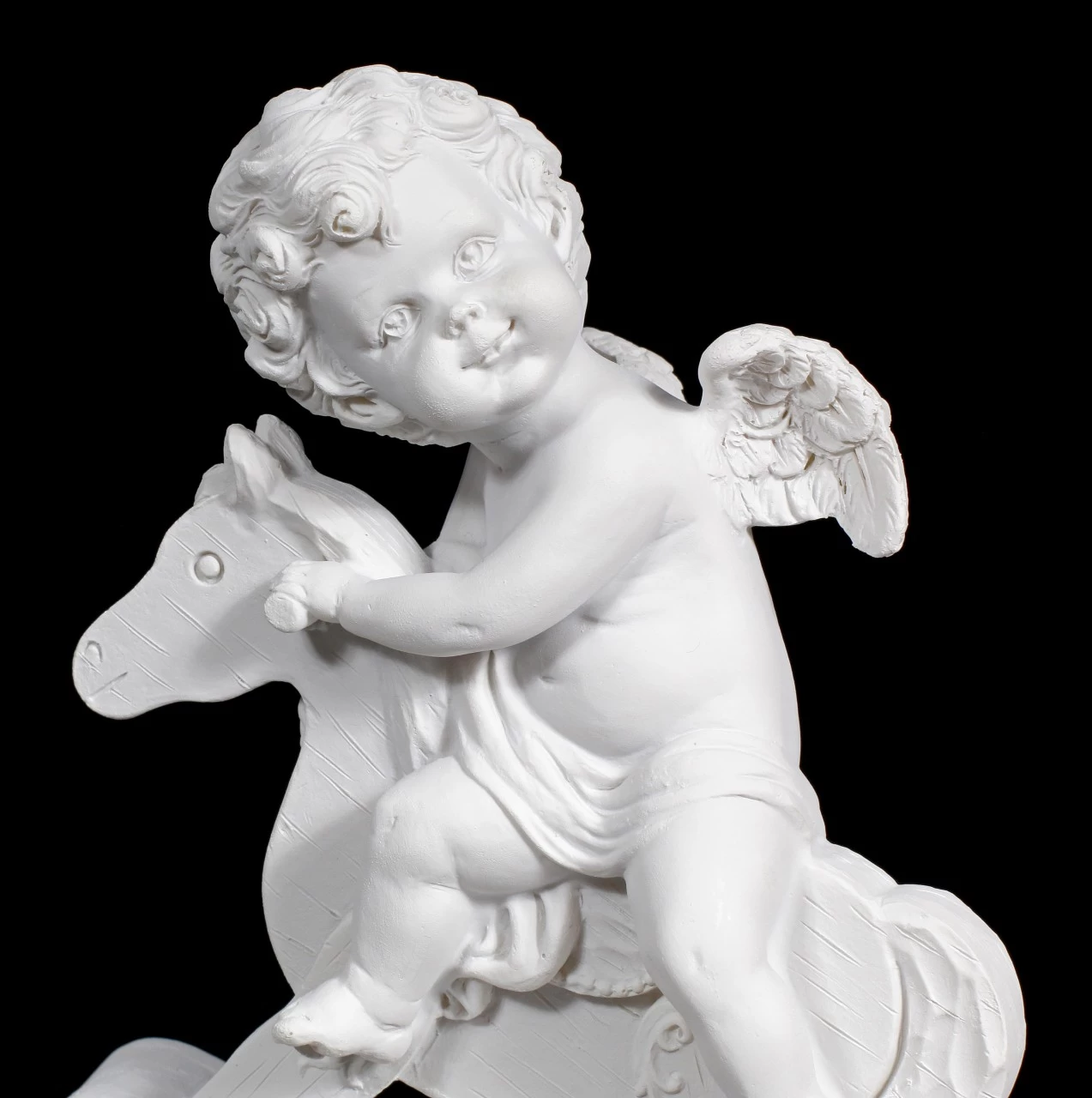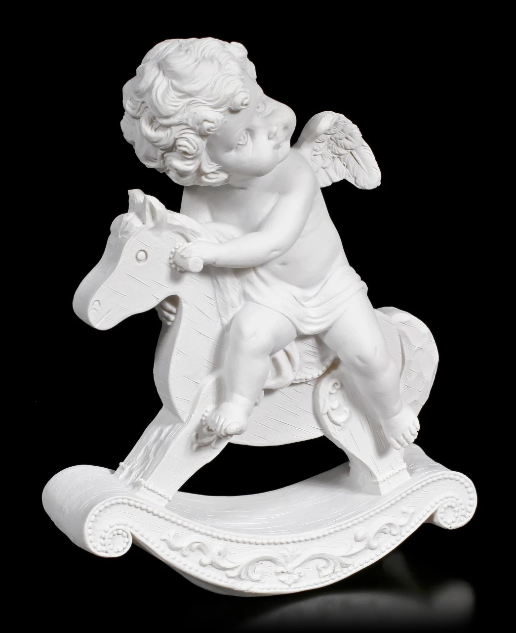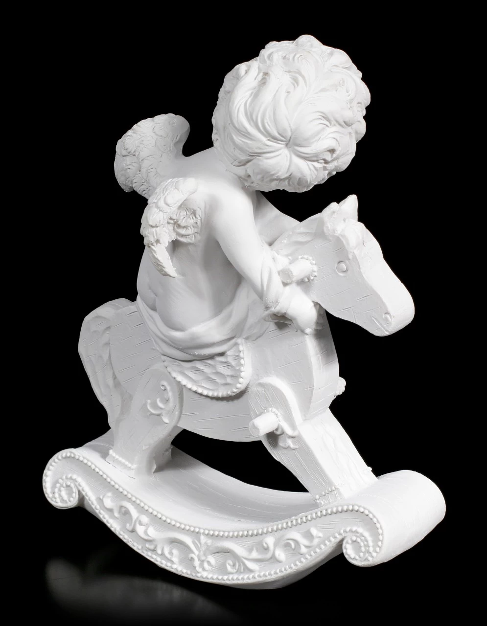 Lustig schaukelt der kleine Cherub auf einem Schaukelpferd. Die Figur wird zu einem liebevollen Dekorationselement in Ihrer Wohnung.