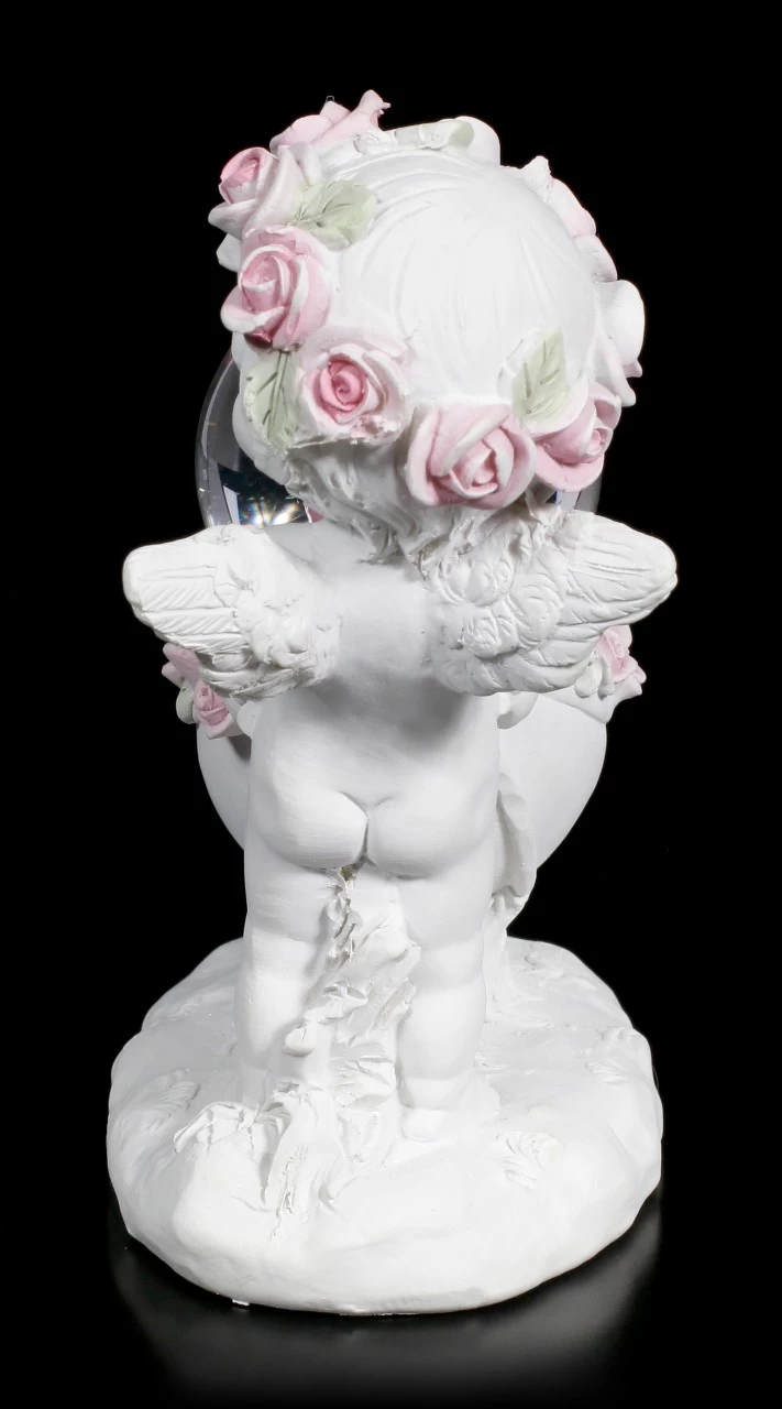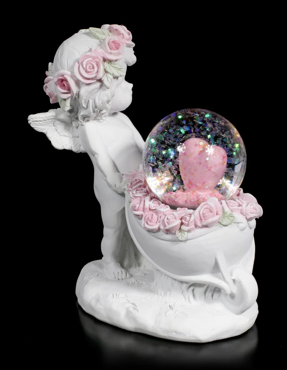 Mit einer Schubkarre bringt der niedliche Cherub Ihren besonderen Menschen viel Liebe vorbei. Die Schneekugel lässt das rote Herz glitzern.