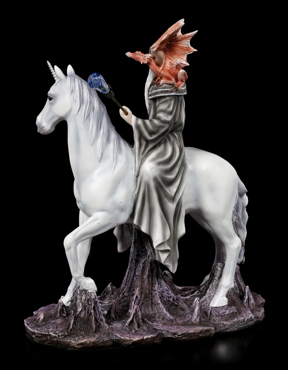 Magische Wesen sind von jeher die treuen Begleiter von Hexen und Zauberern. Der mächtige graue Zauberer hat als Reittier eines der selten gewordenen Einhörner und sein Wächter ist ein junger Feuer Drache. Der Zauberstab des Magiers ist mit einem umwerfenden Kristall verziert. Die handbemalte Figur aus Kunststein (Polyresin) sollte in keiner Sammlung fehlen.